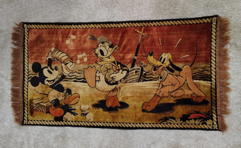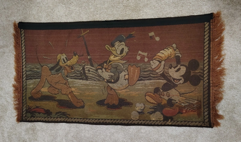 (Disney, c.1930's-1940's) Vintage Rug/Tapestry featuring Walt Disney characters Mickey Mouse, Donald Duck and Pluto in a sea scene with Mickey playing accordion and Donald and Pluto dancing. Tapestry/Rug is in good condition with normal wear from age, including some fraying of the rug corners.