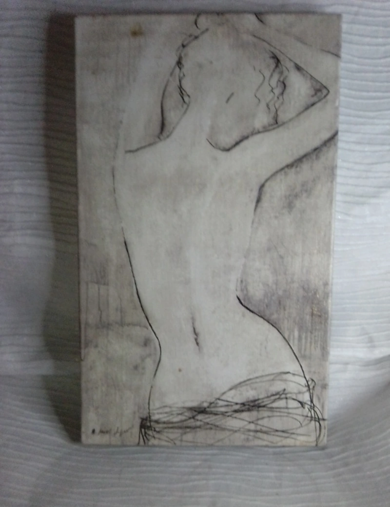 335A striking piece. Features a nude figure in an abstract style. Signed by the artist. This piece would add a touch of calmness to any room.
