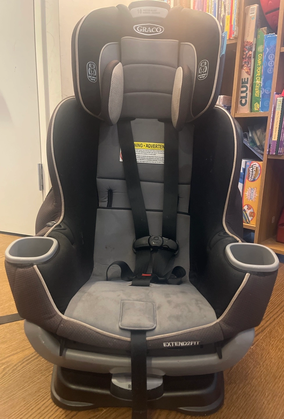 Preowned Grows with child From baby to toddler in one buy Has wear Needs cleaning but still 100% fully functional This is a car seat featuring two cup holders. It includes a harness system and headrest. There is an extendable panel for comfort. This seat is a great purchase to ensure your child travels in comfort.