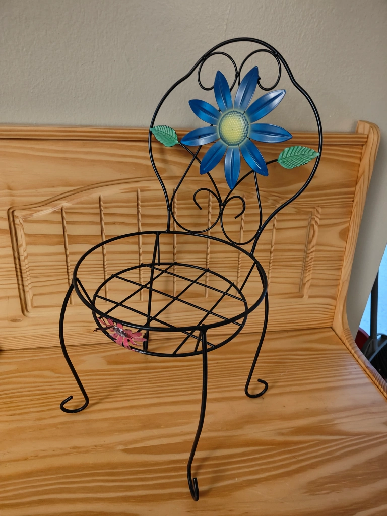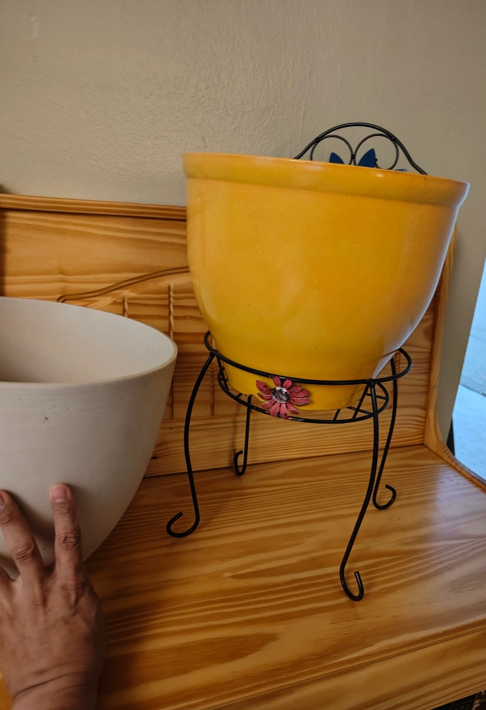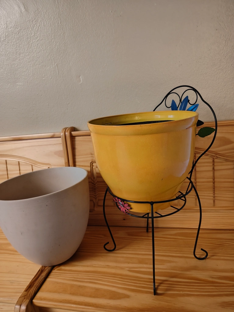 Planter with a decorative metal stand. The stand is black and has a floral design on the back. One planter is white and the other is yellow. These items would make a beautiful display for any plants.