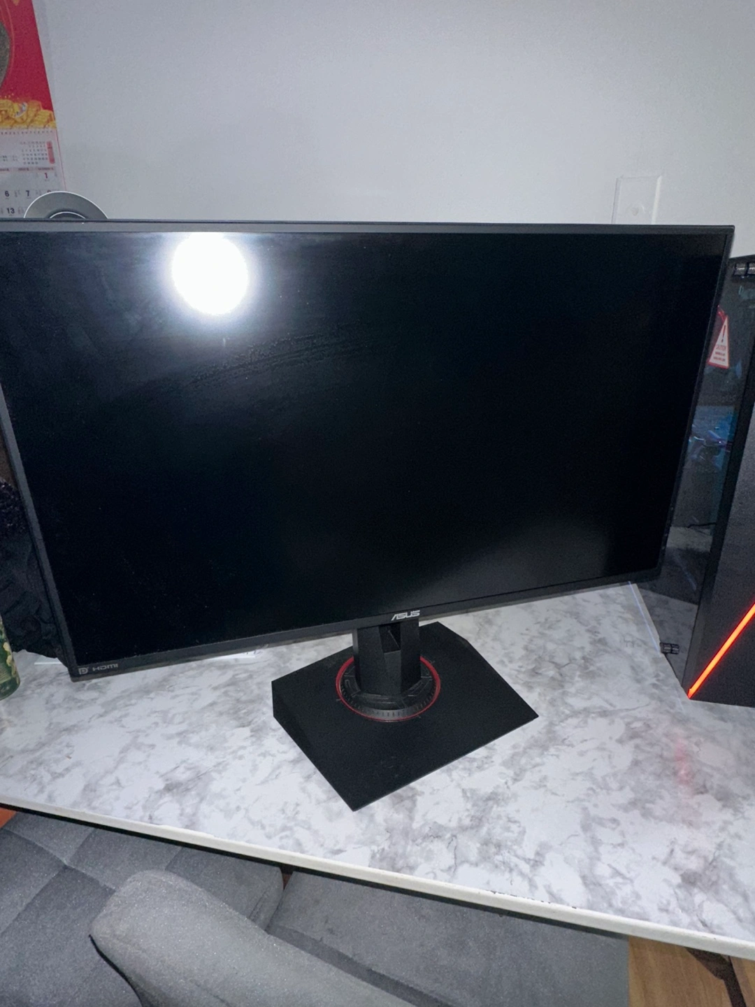 A computer monitor. The base is black with a red trim. The screen is black. This would be great for streaming your favorite shows in high-definition.