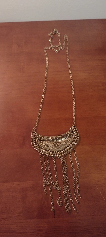 Gold-tone necklace. Features a chain with a decorative pendant. The pendant has several chains hanging down. A perfect addition to any outfit, the right necklace can bring a calming presence to your look.