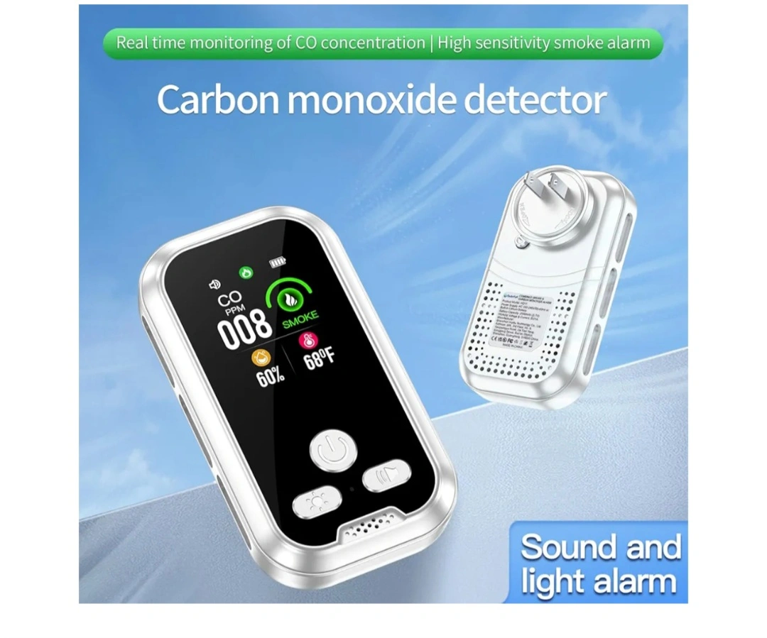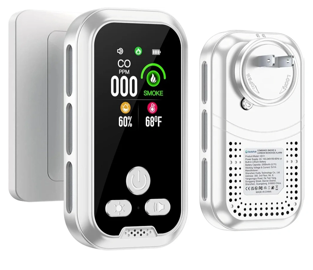 4IN1 Plug in Smoke & Carbon Monoxide Detector Combination Builti-in 2000 mAh Backup Battery HD Screen [Smoke CO Temp Humidity Sensor] Alarm for Home Travel Hotel Indoor (White)