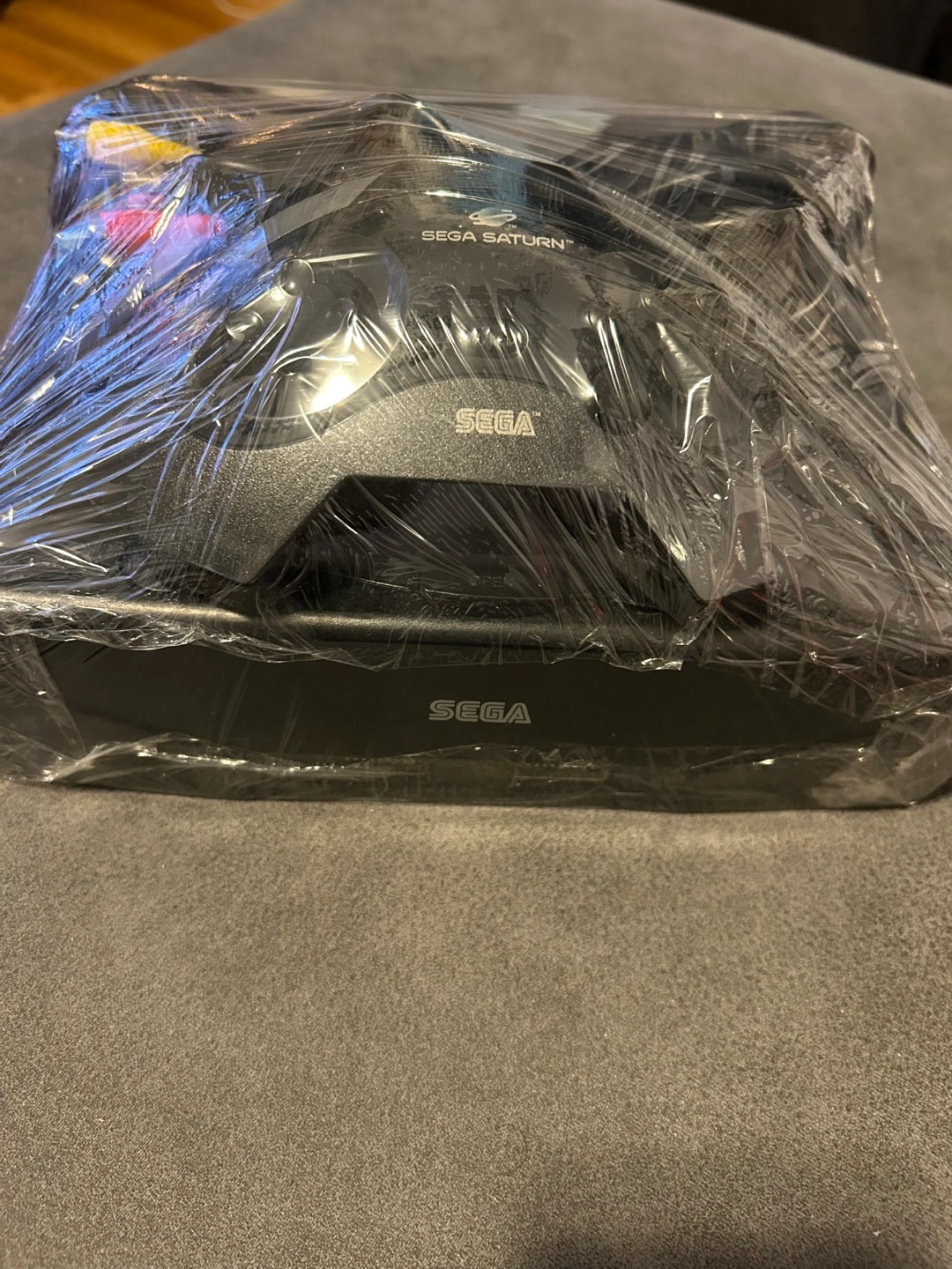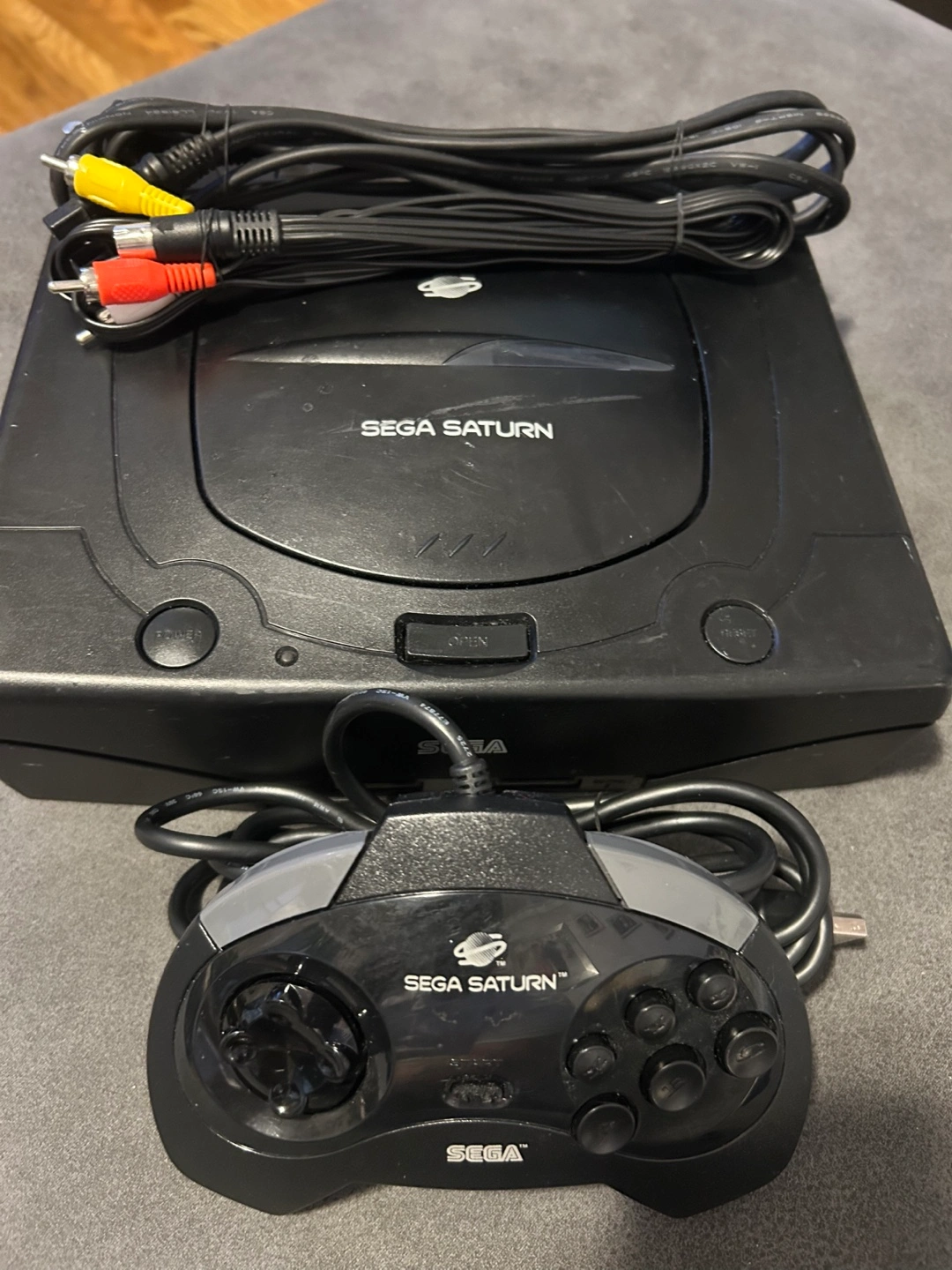 A Sega Saturn game console. Includes a controller and AV cables. The console is in a good condition, ready to be used to play some classic games, which can be a great way to unwind after a long day.