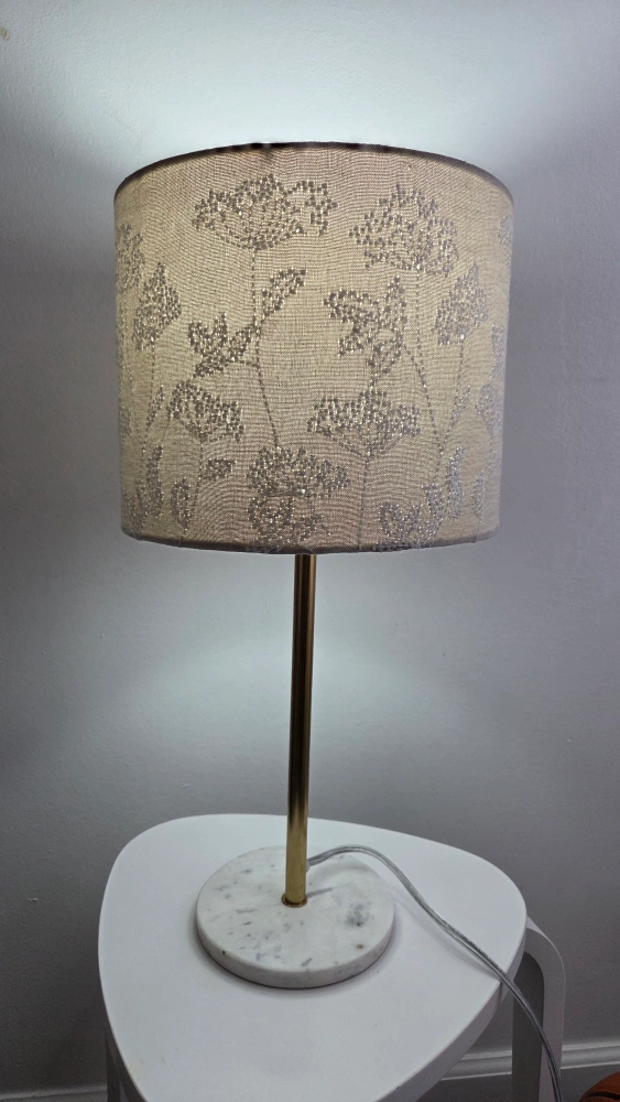 A lovely table lamp. Features a gold-colored metal stem, and a white marble base. The lamp shade showcases an intricate floral embroidery pattern. This lamp is perfect to make any room feel warm and cozy.