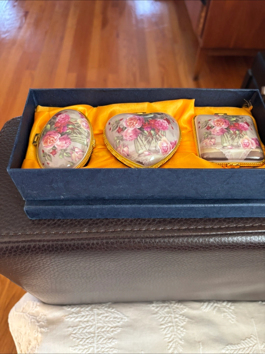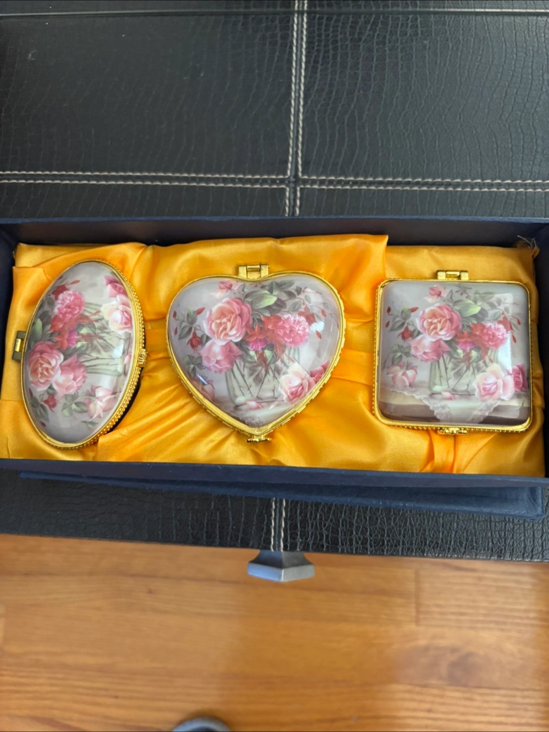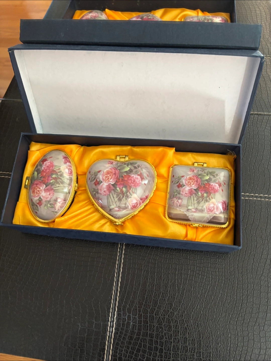 10These three lovely trinket boxes would make a perfect gift for someone special. Each box has a floral design on top, with a gold-tone trim. They come in oval, heart, and square shapes, all nestled in a navy blue box with a yellow satin lining.