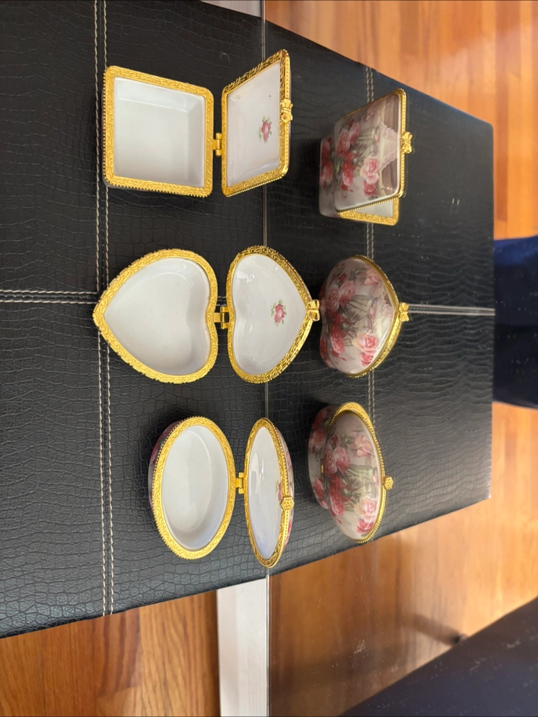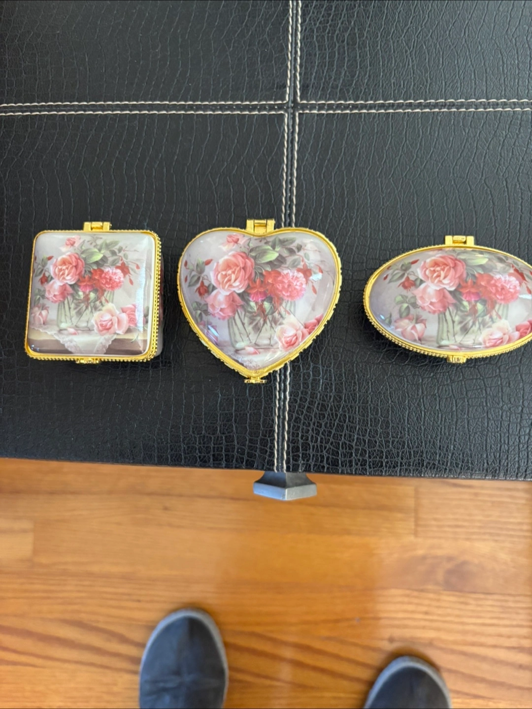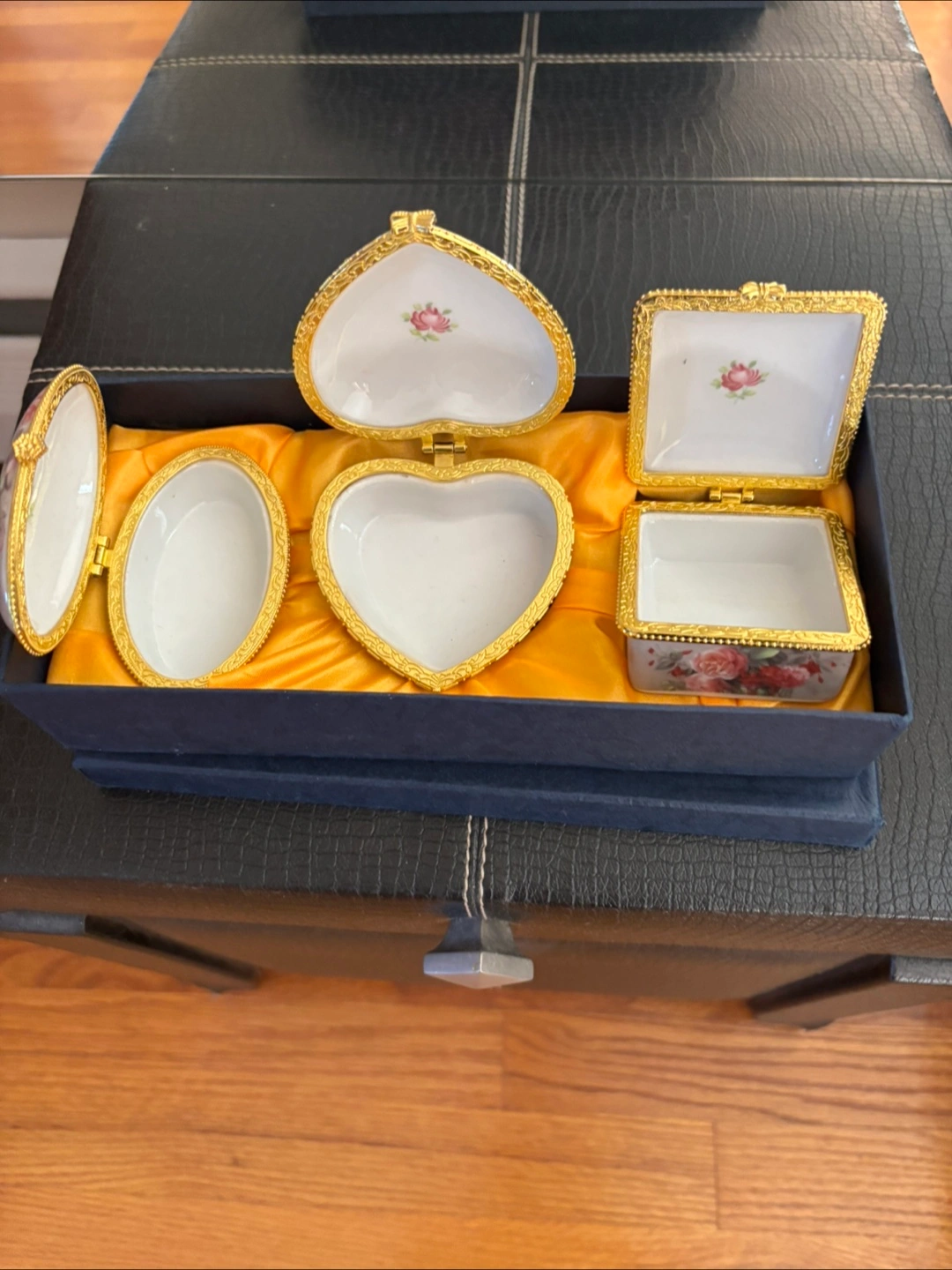 10These three lovely trinket boxes would make a perfect gift for someone special. Each box has a floral design on top, with a gold-tone trim. They come in oval, heart, and square shapes, all nestled in a navy blue box with a yellow satin lining.
