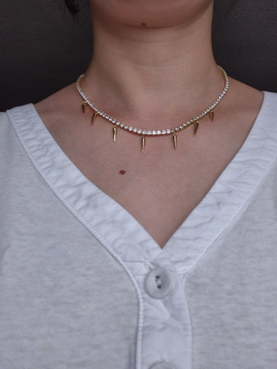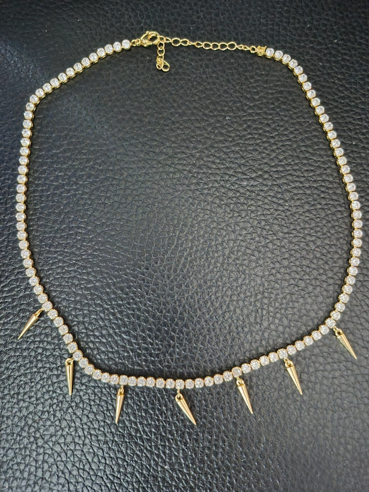 A gold colored necklace. Rhinestones and spikes hang down. It will surely be a statement piece for any occasion. Not real gold or diamonds.