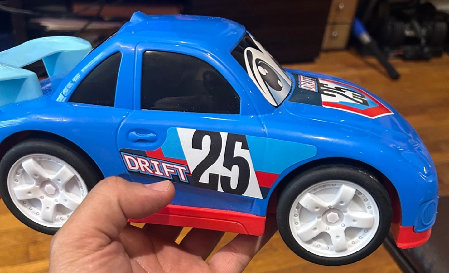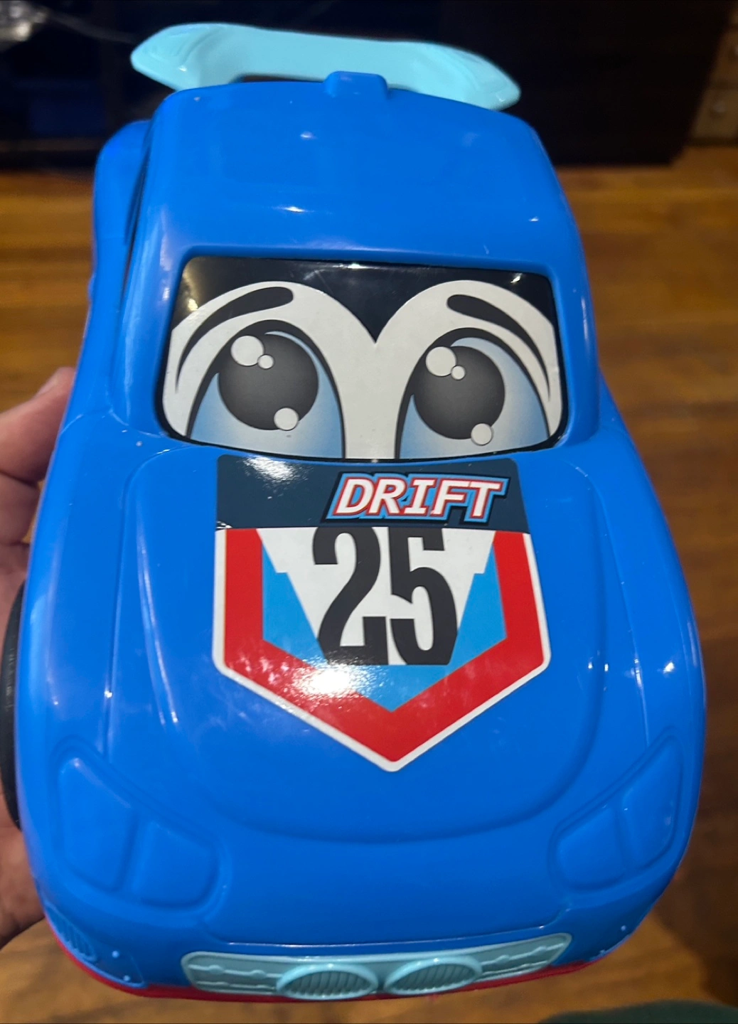 234A blue toy car. Features a cartoon-like face on the front. White wheels and a spoiler. Perfect for playing or displaying.