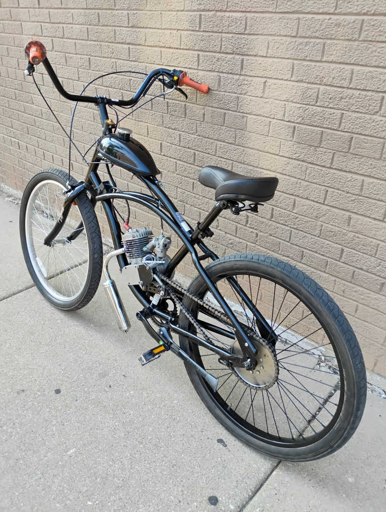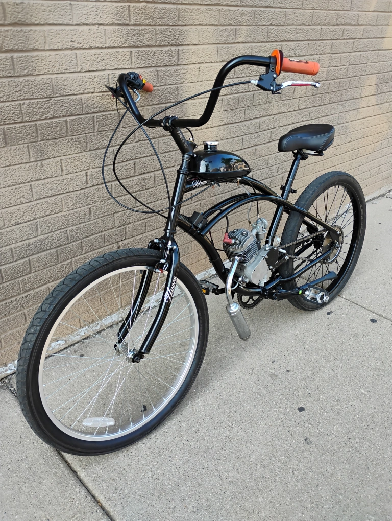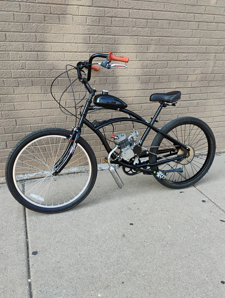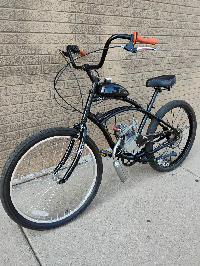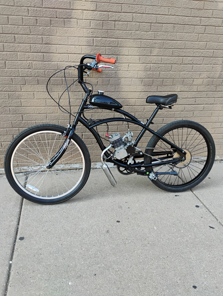 14$350 CASH SAME DAY SALES, LOCAL PICKUP 26" Hyper Single Speed 80cc Motorized Beach Cruiser Hyper Beach Cruiser Frame, Very Low Miles 80cc Motor, 44 tooth sprocket, Front Pad Brakes & Rear Coaster Brake 2L Fuel tank (Averages 30 - 40 Miles Per Gallon) 30 - 35 Top speed. Built And Road Tested To Ensure Quality Before Listing to the Public. Please keep in mind that these bikes are investments and will require light maintenance to ensure longevity and years of reliability. scooter Car bike motorcycle moped pedal gas cycle mountain bike trail deliver Uber eats door dash motor bike
