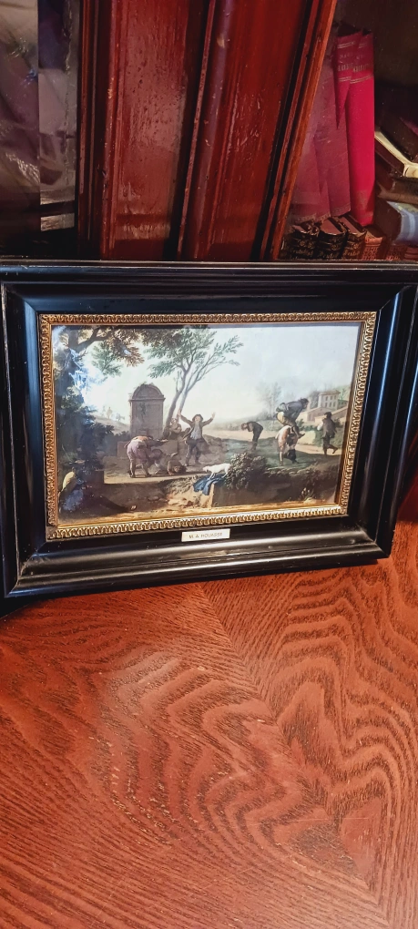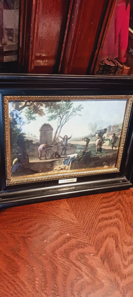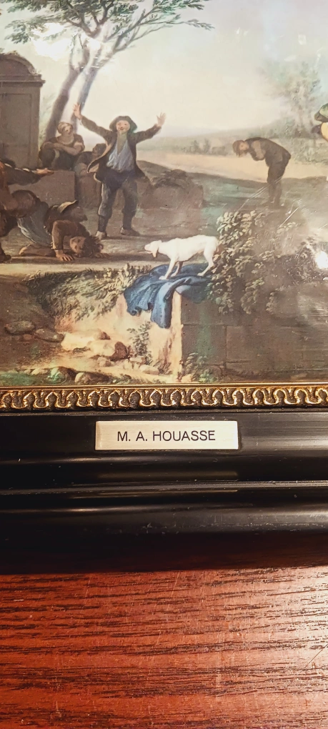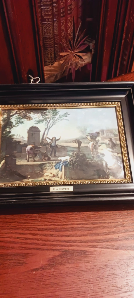 THE DWARVES BY M.A. HOUASSE FRENCH PAINTER (1680-1730) ENAMEL PAINTING FRAMED ARTWORK. 12'×10". Excellent condition. ALL MY PRICES ARE NEGOTIABLE !!! The framed artwork features a detailed, colorful depiction of a classical scene. The frame is black with gold trim. You could place this artwork in your home to add some sophisticated style.
