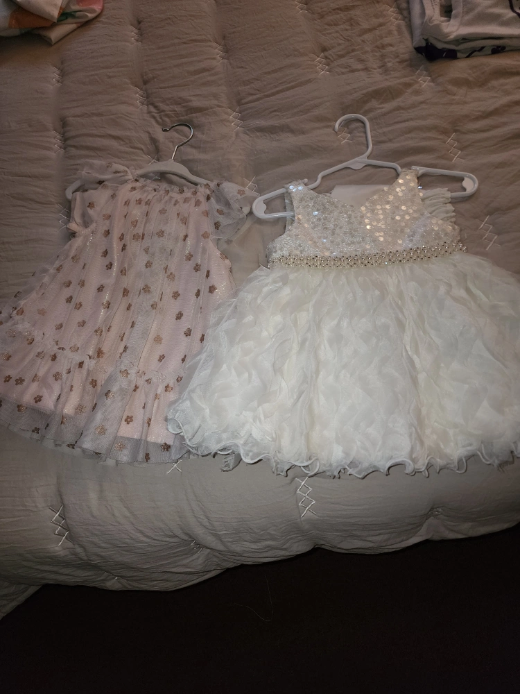 72Beautiful dresses for a special little girl. One dress is pink with gold flowers, and the other is white. A great outfit for a special occasion, perhaps a tea party.