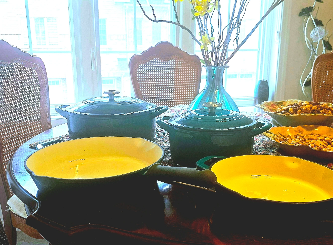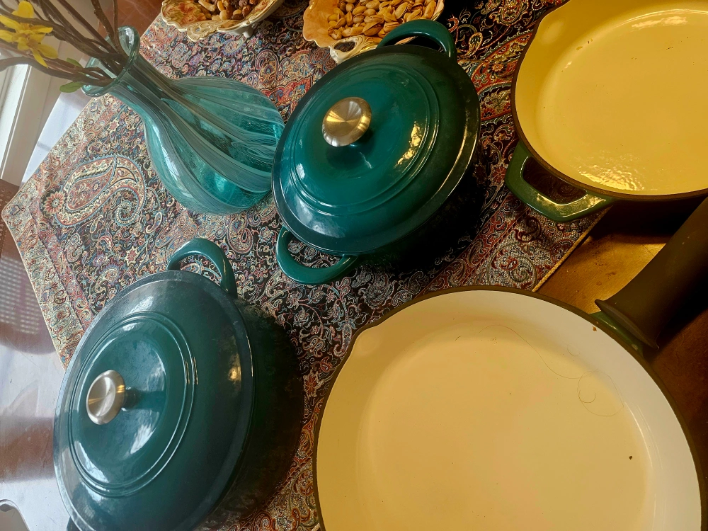 63Teal coloured cookware set. Includes pots and pans. Some pieces have lids. Perfect for making a delicious dinner on a slow evening.