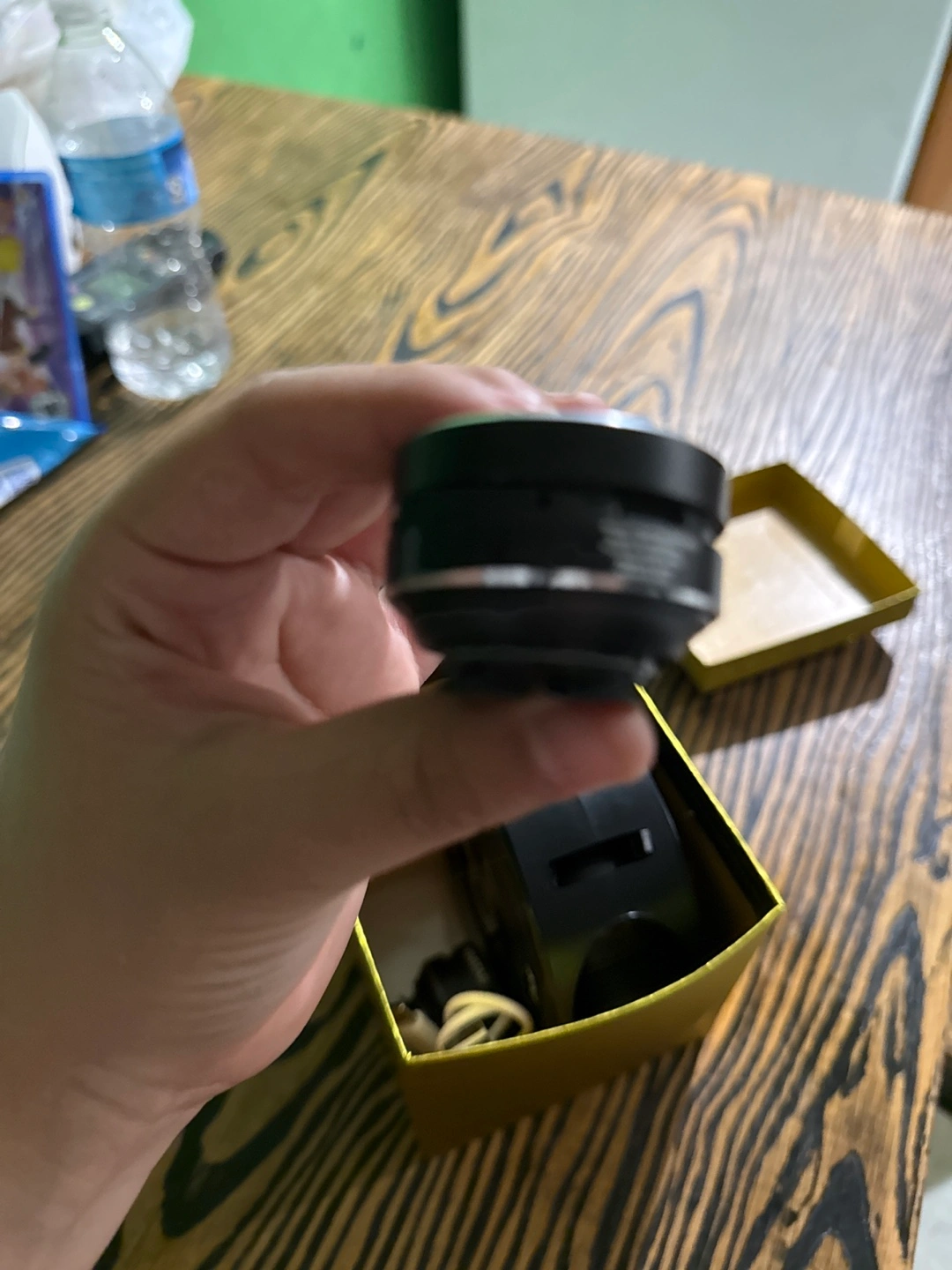 A black speaker with silver details. It has a circular shape and a patterned top. Perfect for listening to your favorite music while relaxing.