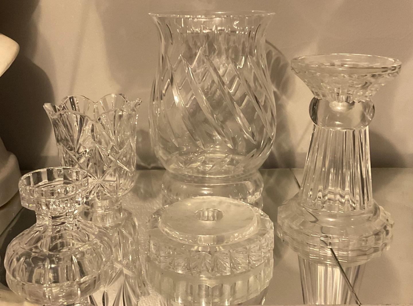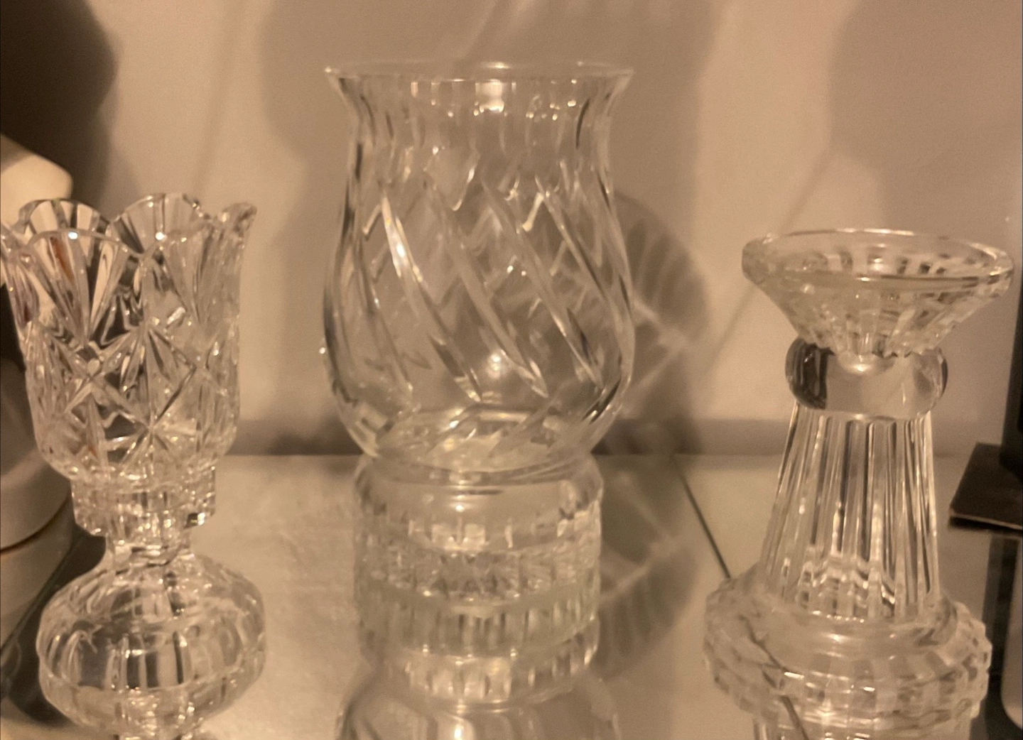 Vintage Illusions by Sanobor Lead Crystal Hurricane Candle Holder set . Hand Cut And Handblown lovely assortment of elegant glass pieces. Various shapes and sizes. Perfect for adding ambiance to any space. You can always light a candle and unwind after a long day.