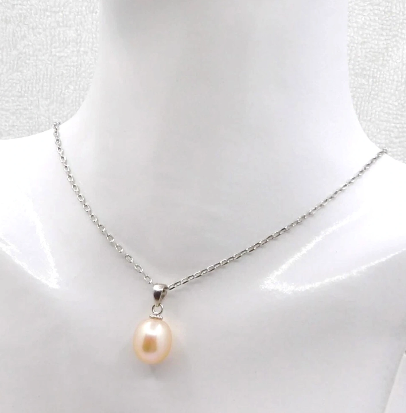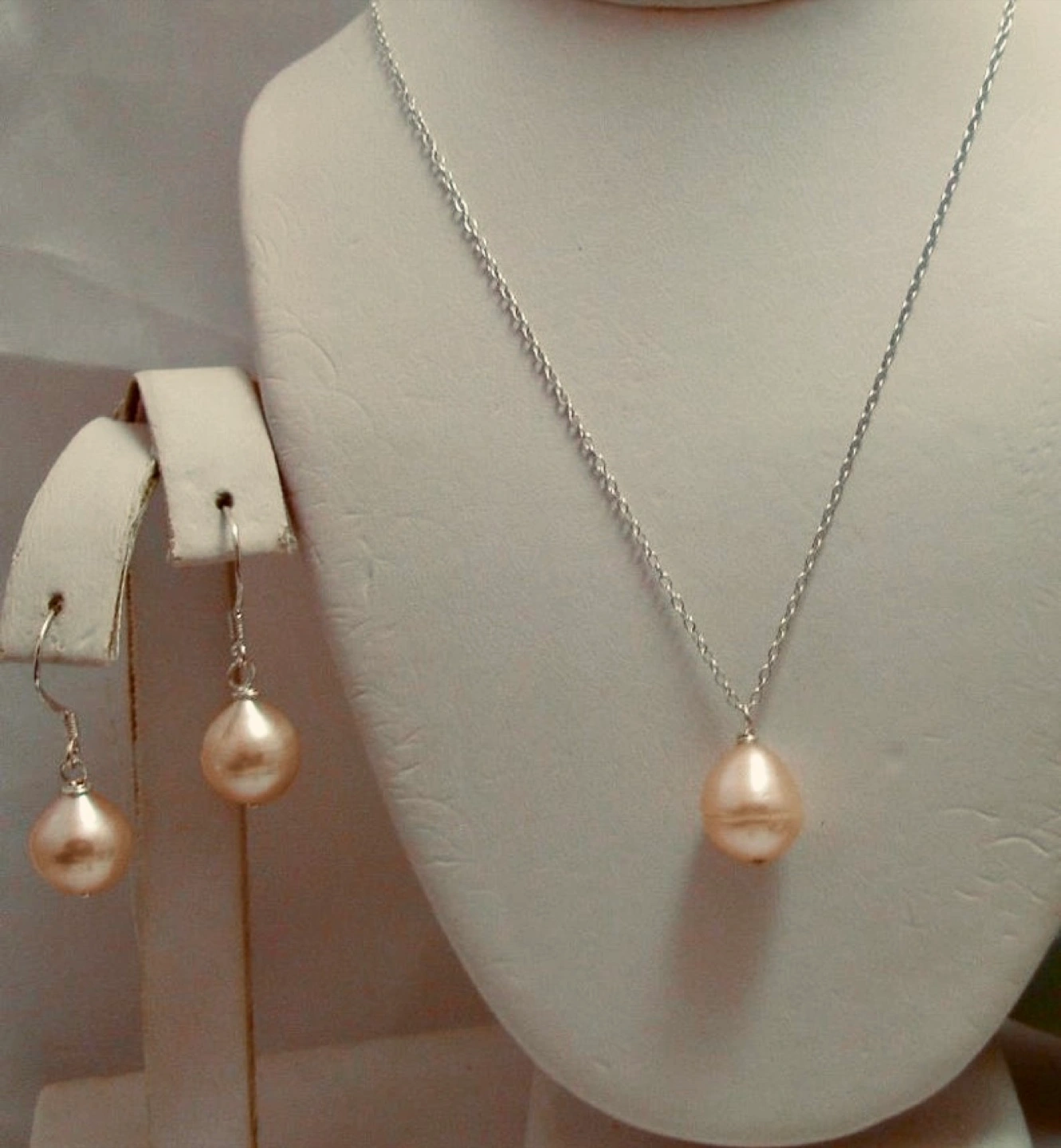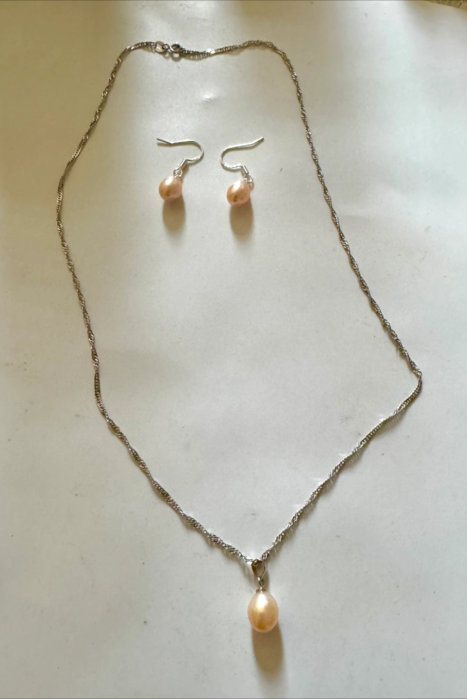 A beautiful matching necklace and earrings set. 925 Sterling Silver chains and hooks. The pendant and earrings feature a tear-drop freshwater ping pearl. Wearing this will make your day feel a little more gentle.