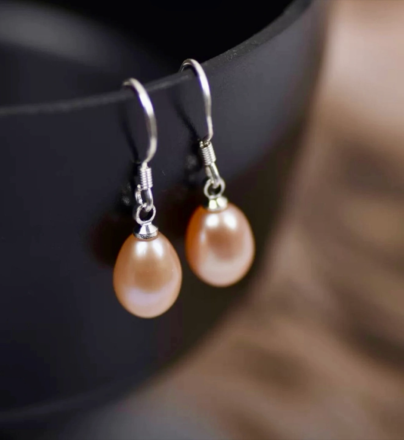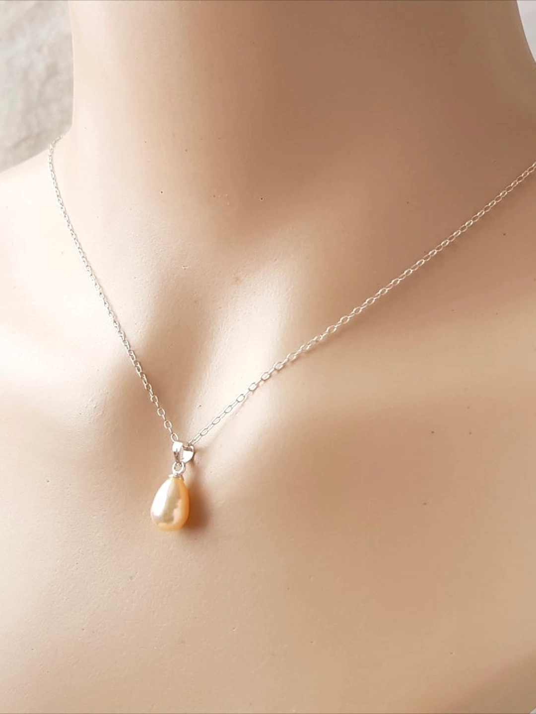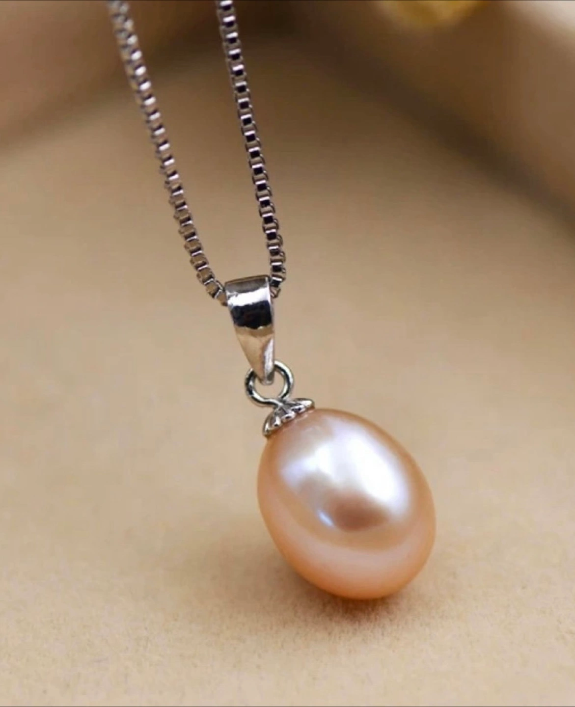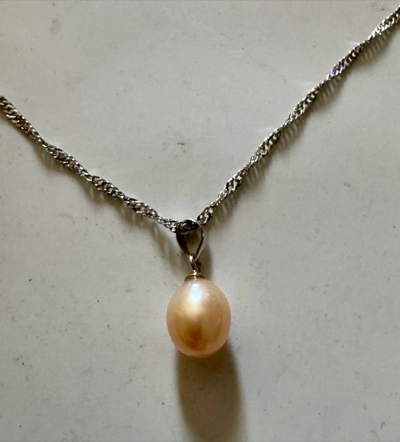 A beautiful matching necklace and earrings set. 925 Sterling Silver chains and hooks. The pendant and earrings feature a tear-drop freshwater ping pearl. Wearing this will make your day feel a little more gentle.