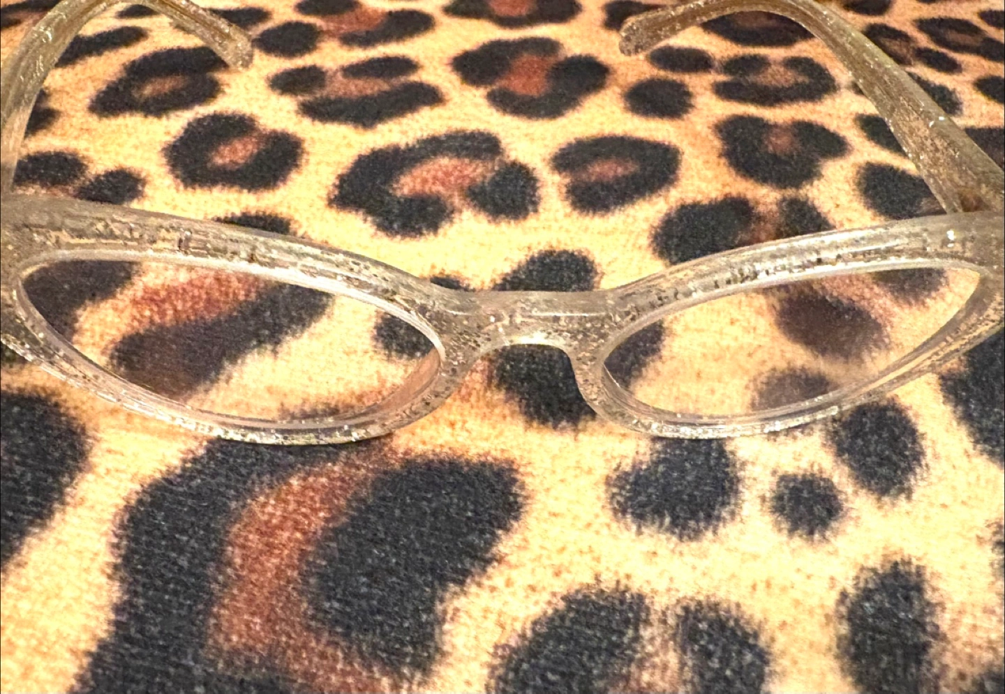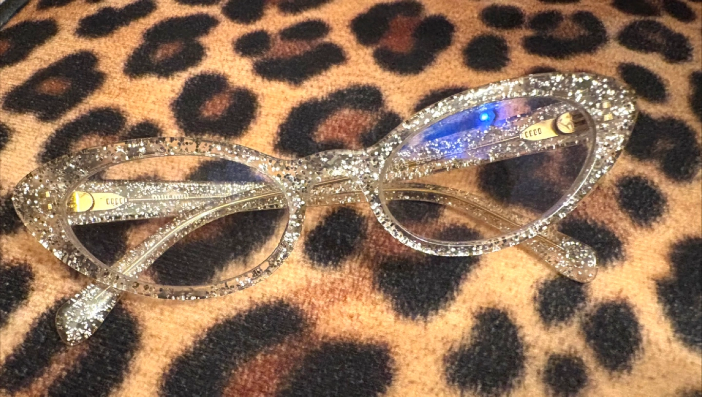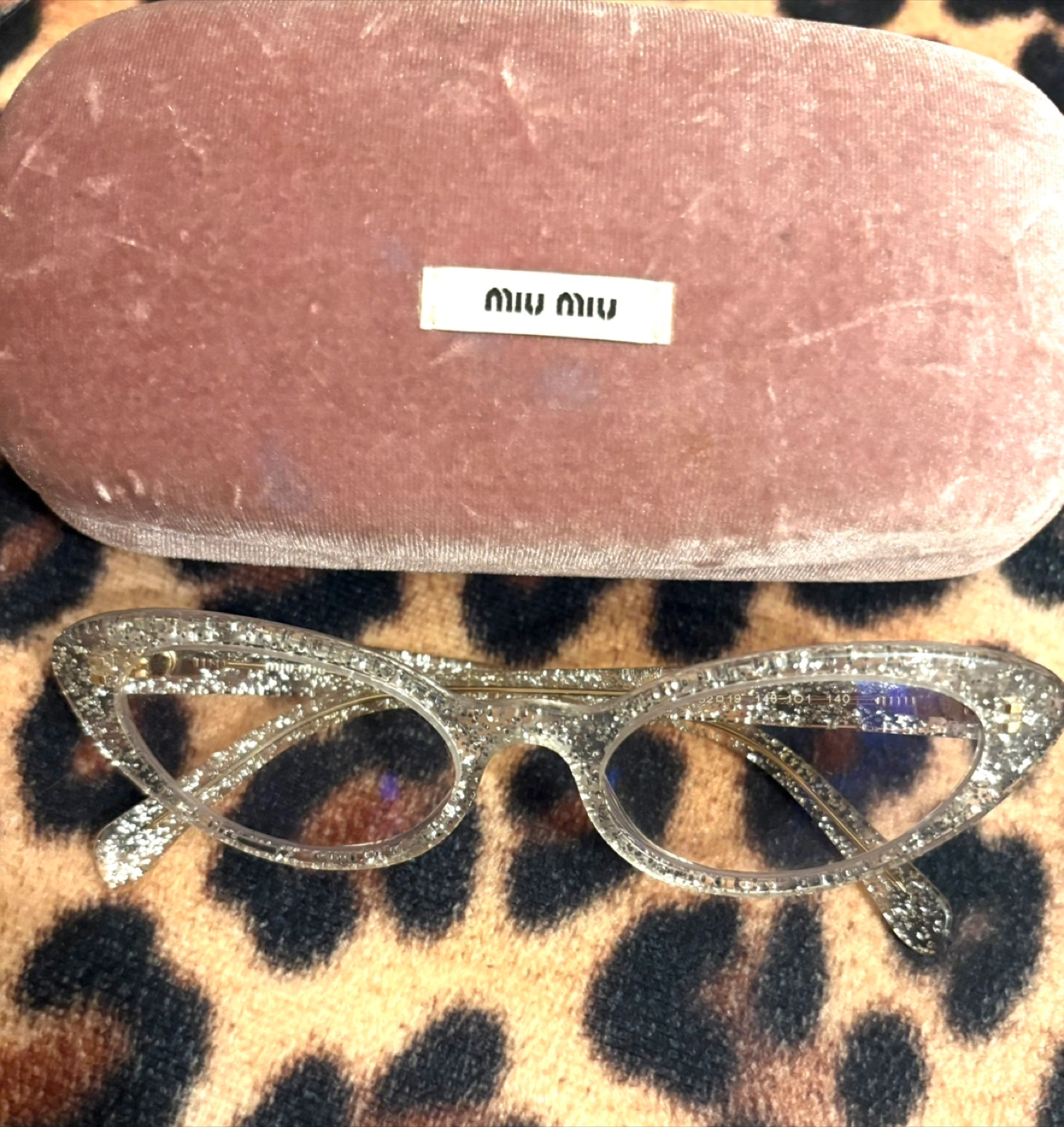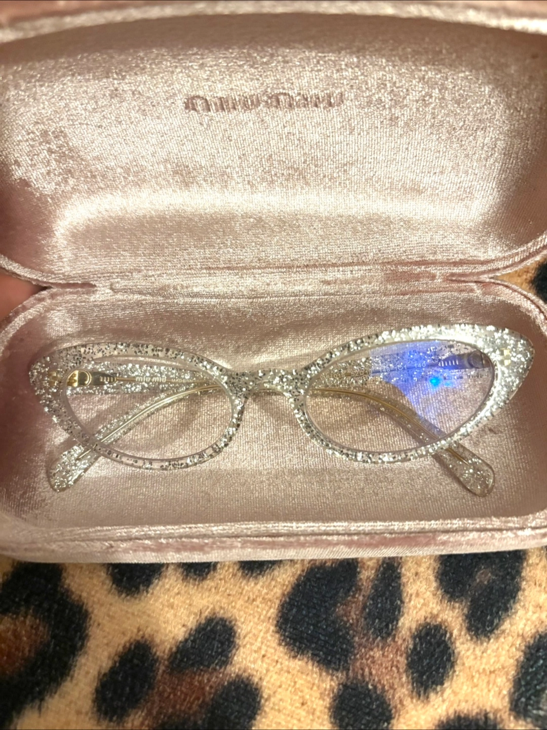 134Miu Miu Glittery cat eye blue light glasses that transform into sunglasses in the sun - Paid $600 - 2-for-1: Can be worn indoors or out! - Incredibly unique: Custom made for working at a computer and outdoors - Can be tailor made to YOUR prescription if taken into an eyeglasses store - Blue light protection minimizes headaches, fatigue, eye strain and looks chic