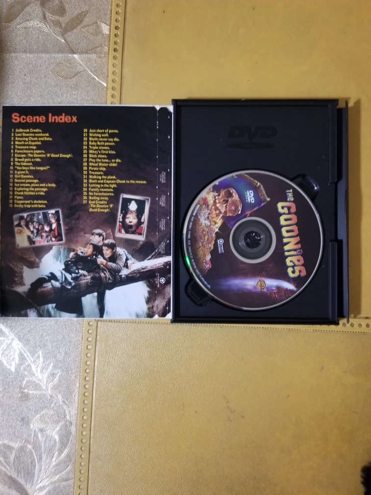 DVD case for The Goonies. Features the scene index on the inner part. Includes the disc. Watching this at home can be a great way to relax. cash only. no shipping. meet up in public place. serious inquiries only.