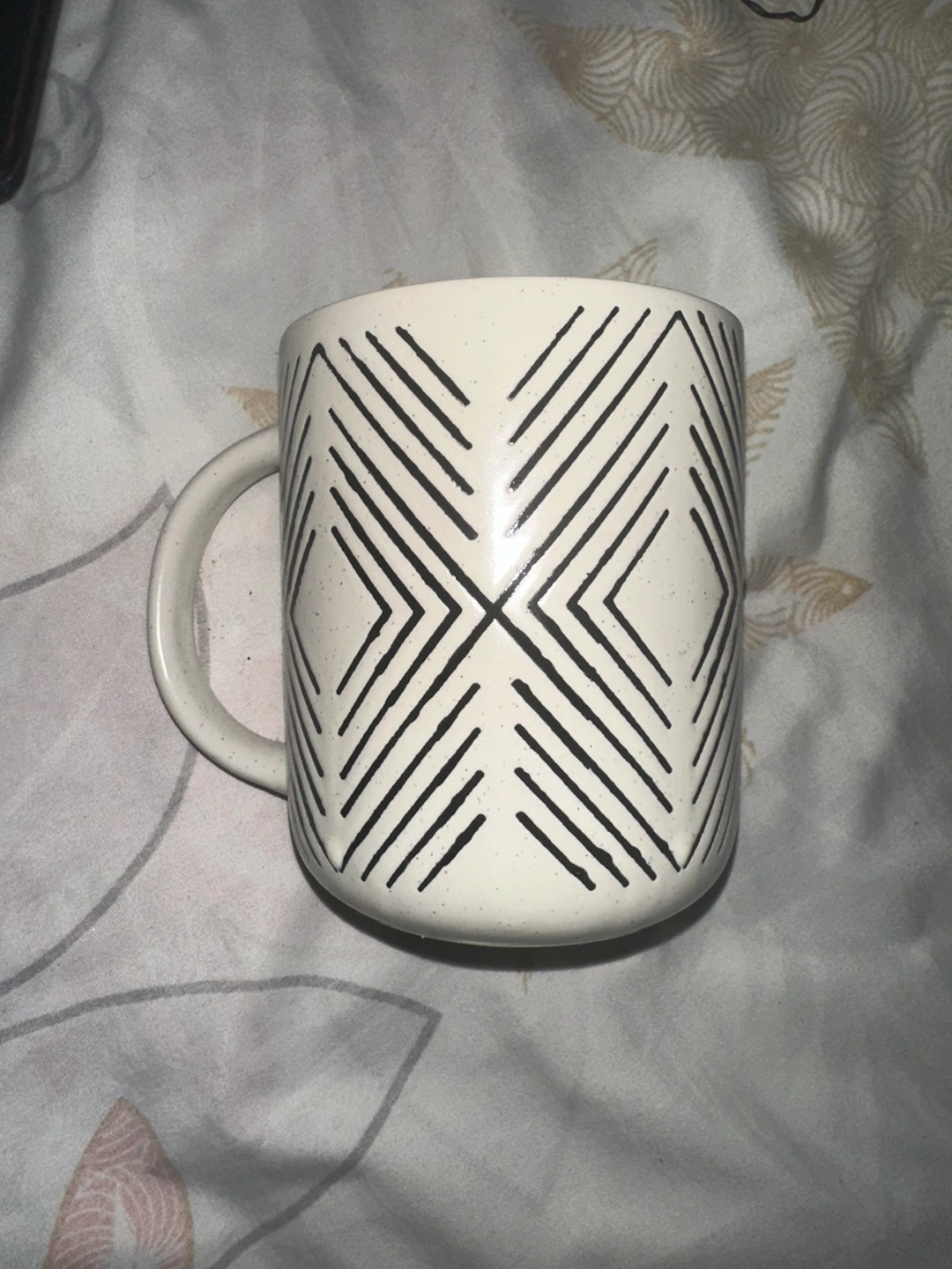 1000+Selling a ceramic mug with a unique geometric design. It's in great condition and ready for a new home! Perfect for your morning coffee or tea
