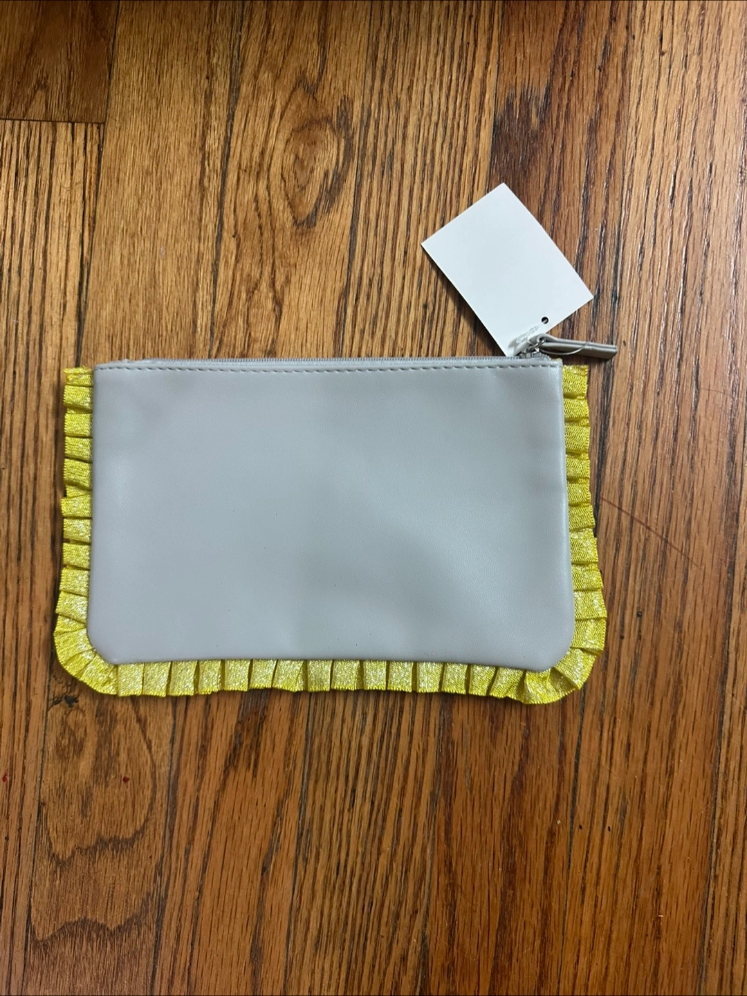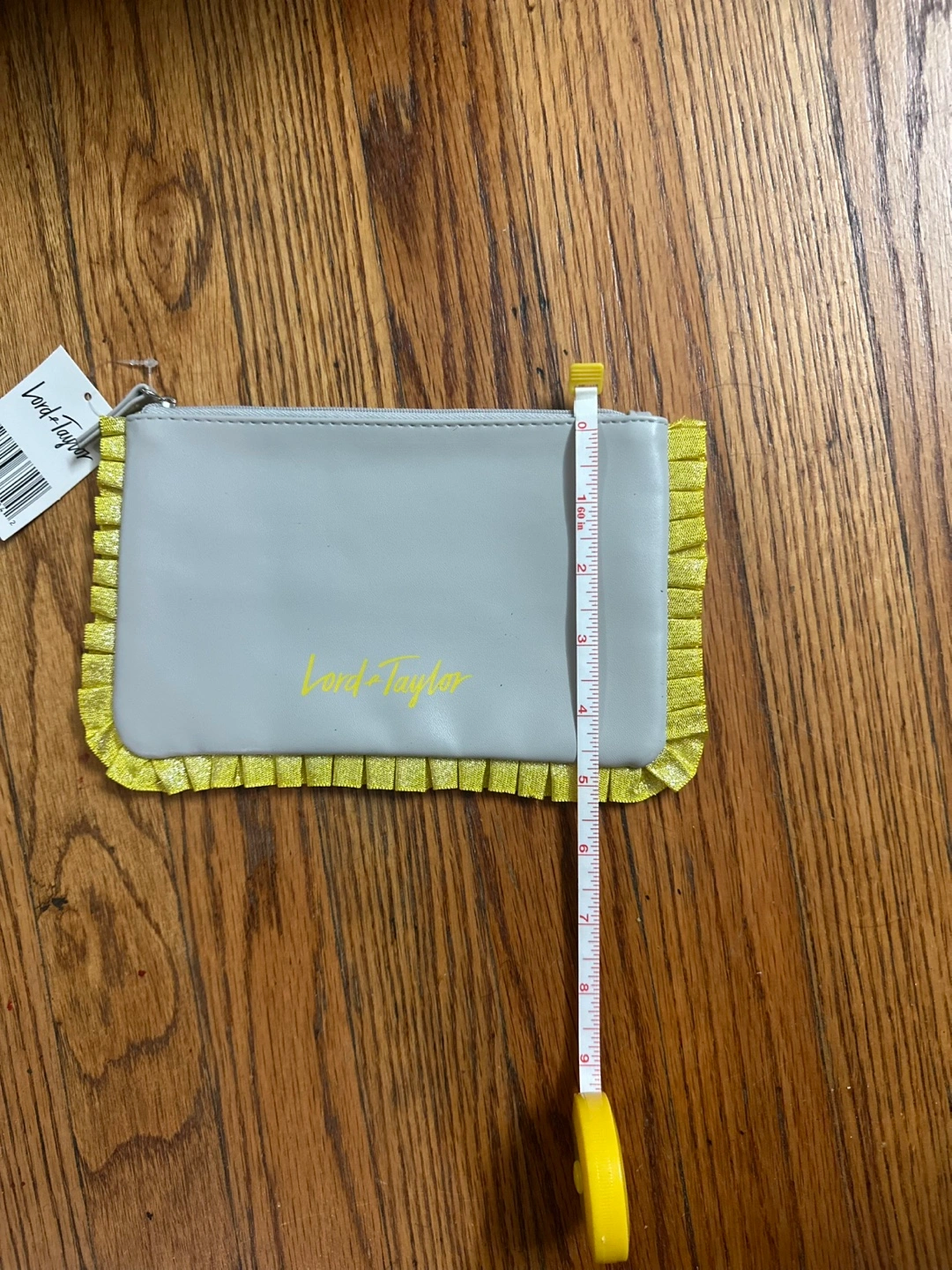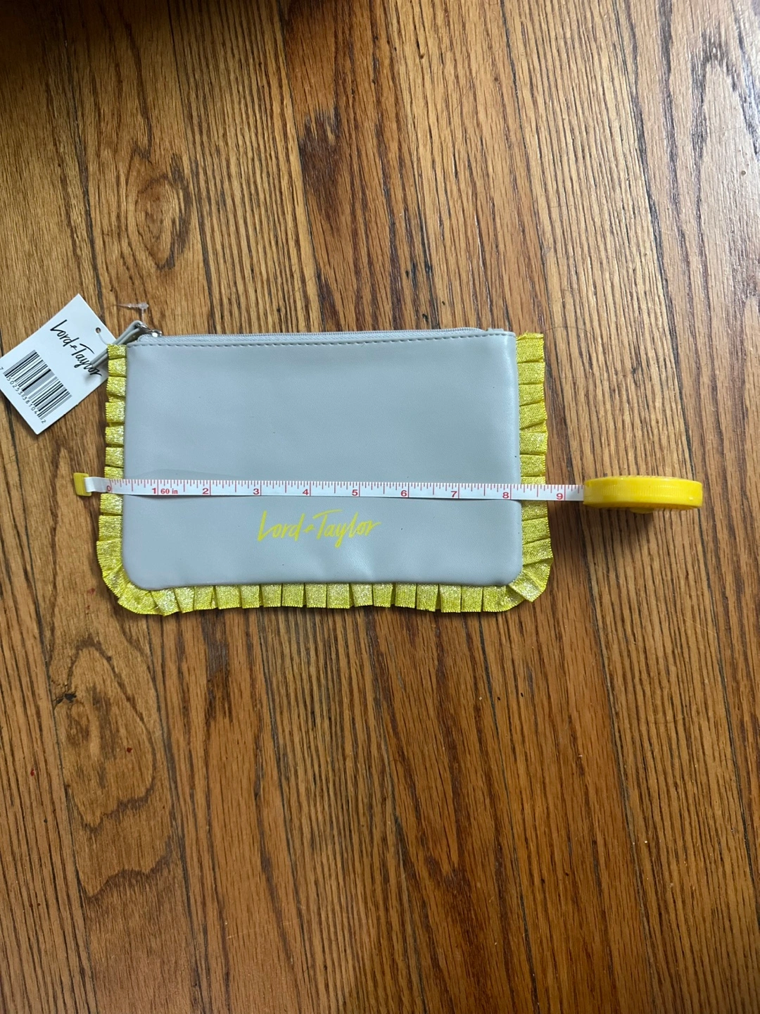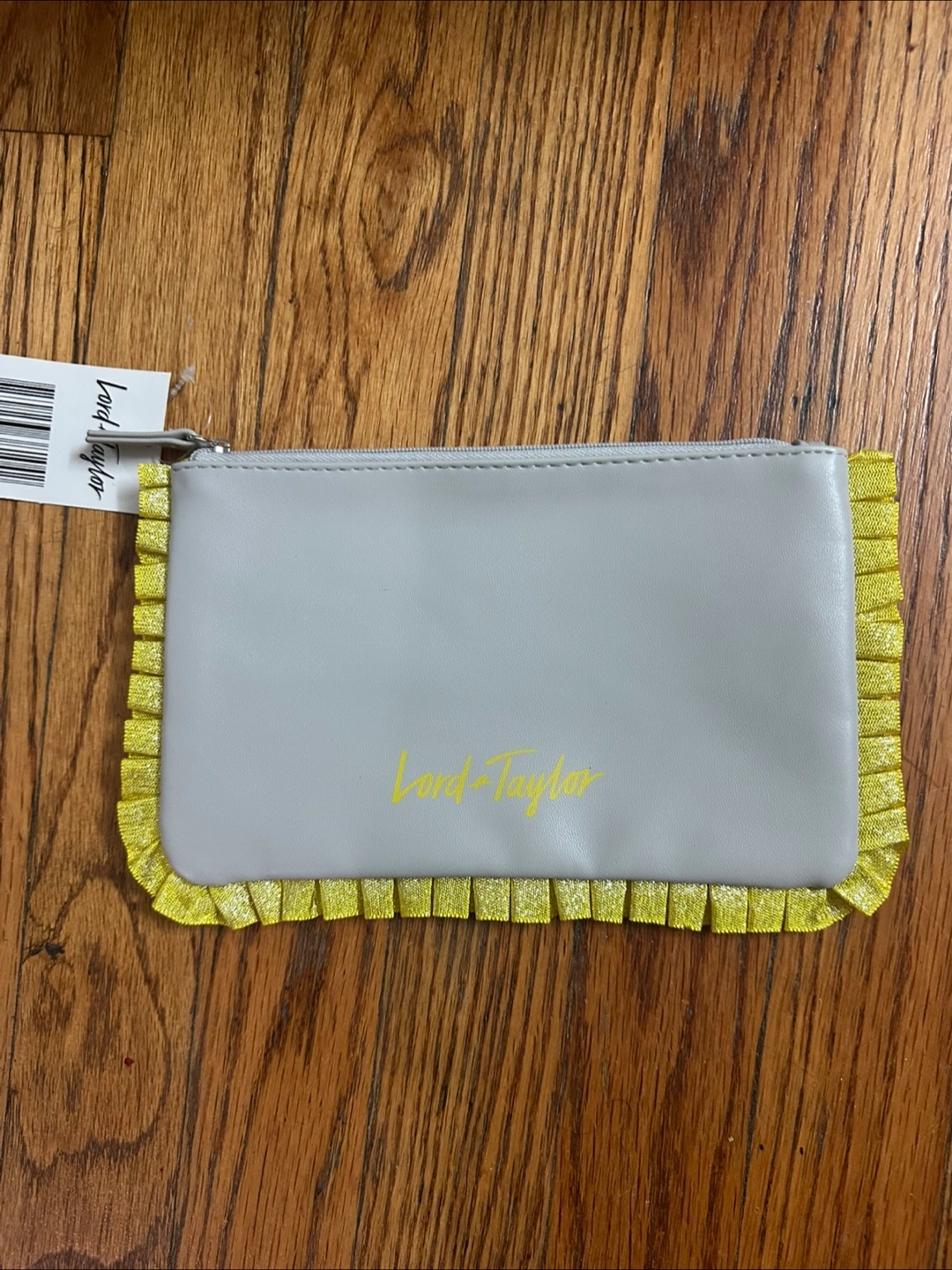 Here's a cute Lord & Taylor pouch! It's gray with yellow accents. It's about 8 inches wide and 5 inches tall