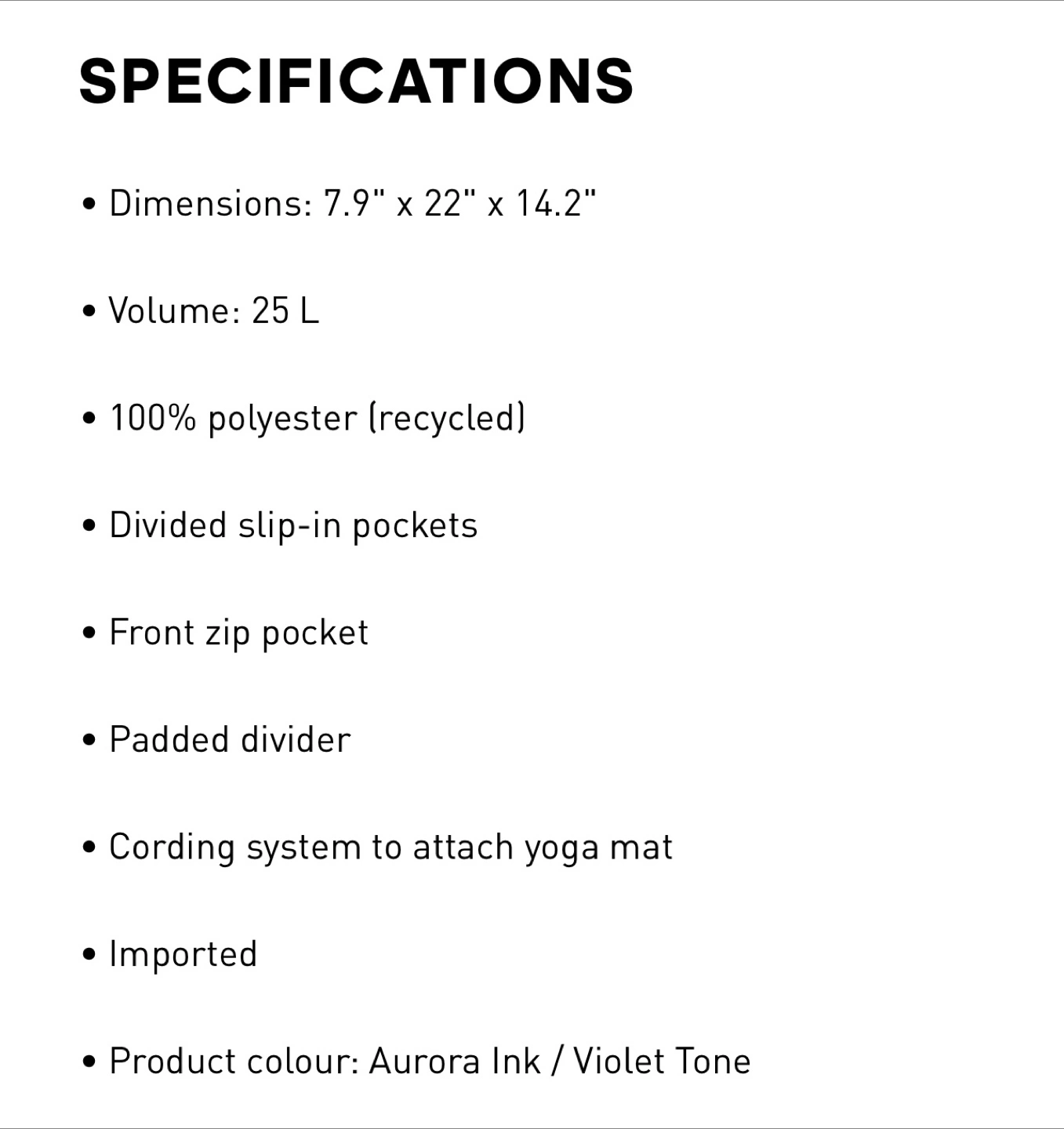 - Includes a padded divider and a cording system to attach a yoga mat