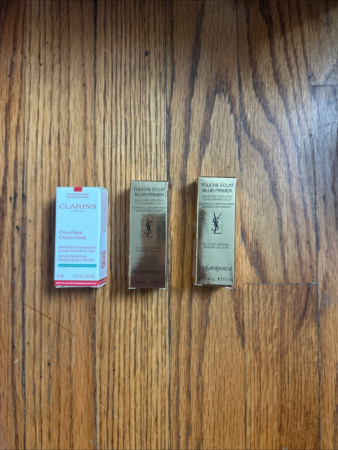 Brand new Clarins Cryo-Flash Cream-Mask (8ml) and two YSL Touch Eclat Blur Primers (10ml each) for sale! These are great for blurring and illuminating skin radiance and instant tightening
