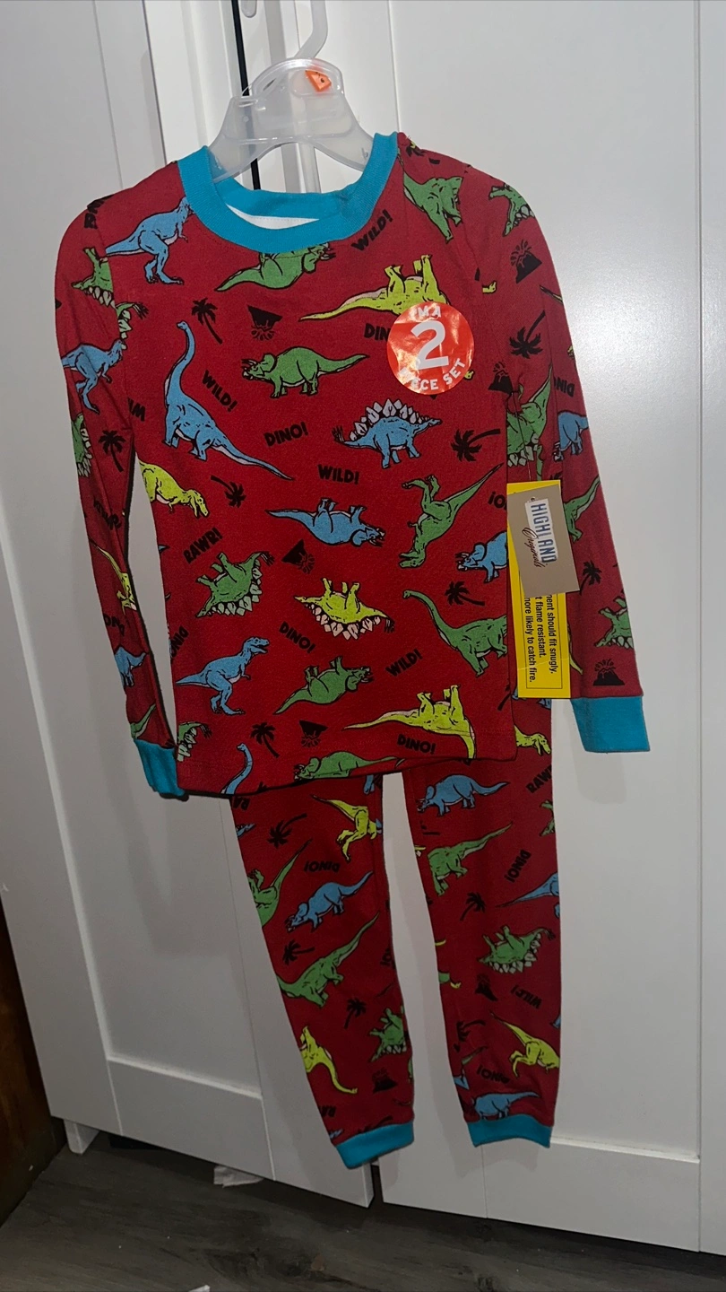 Cute Highland Originals dinosaur pajama set in size 5/6! These snug-fitting, flame-resistant pajamas are perfect for your little one. They're made of 55% cotton and 45% polyester, so they're soft and comfy for bedtime.