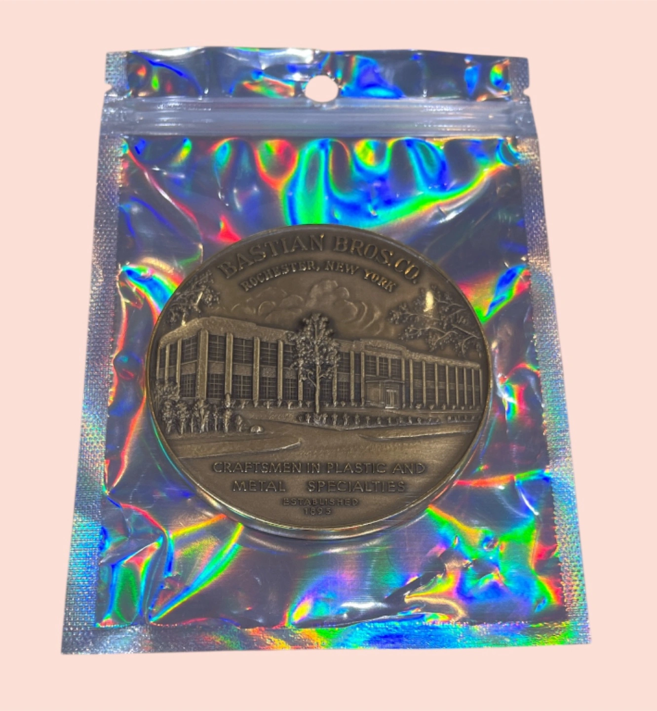 Selling a 4” Bastian Bros. Co. Rochester, New York medallion / Paper Weight . It features the company's building and the words "Craftsmen in Plastic and Metal Specialties Established 1895". A unique piece of history! Please look at the photos carefully As you can see they is a greenish color it can be clean with brass cleaner