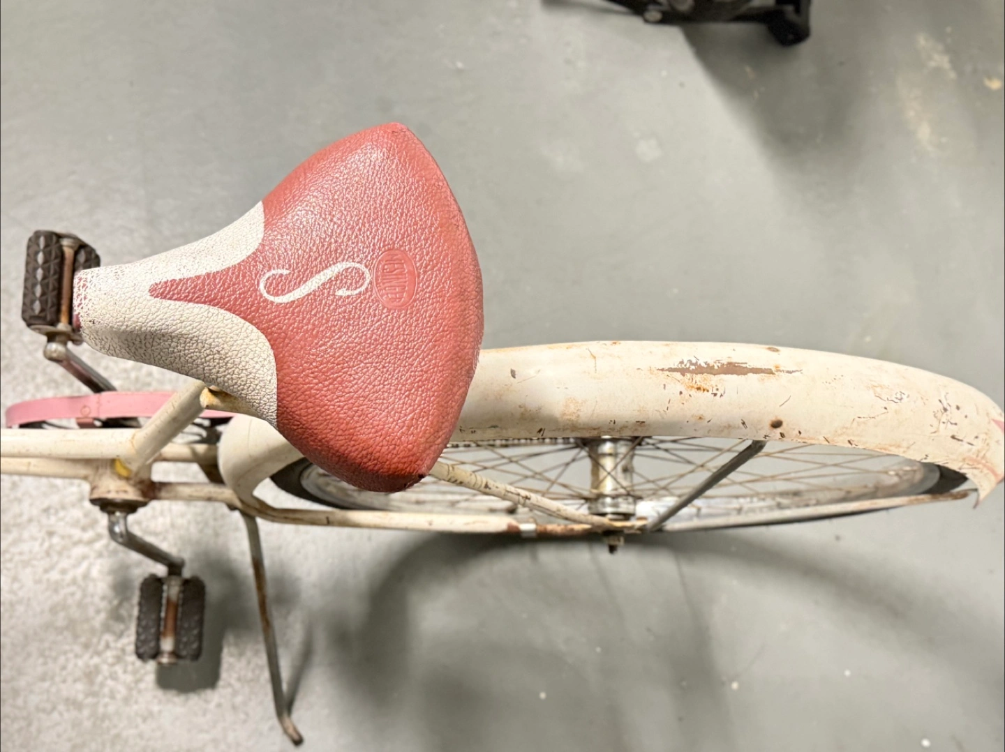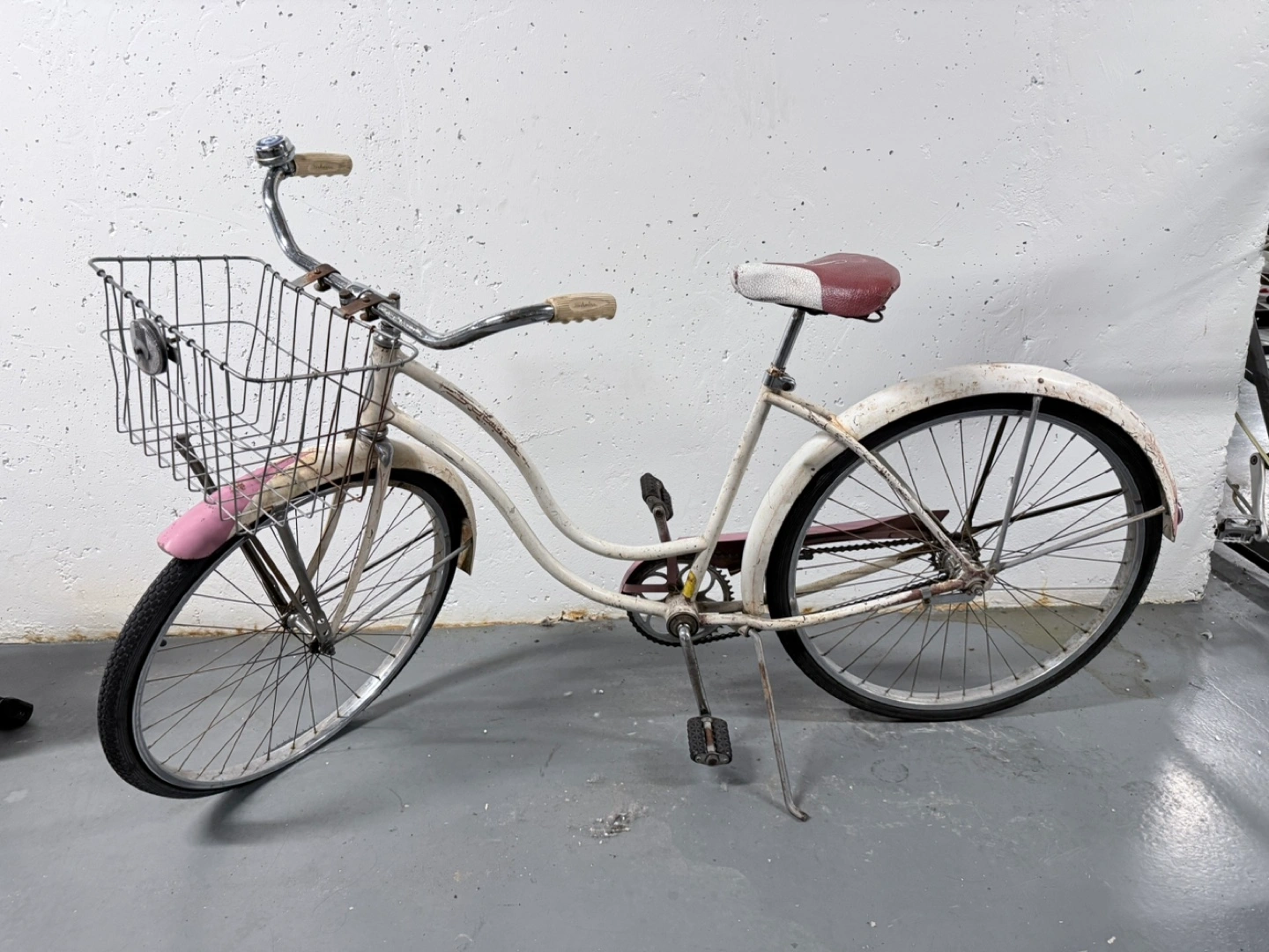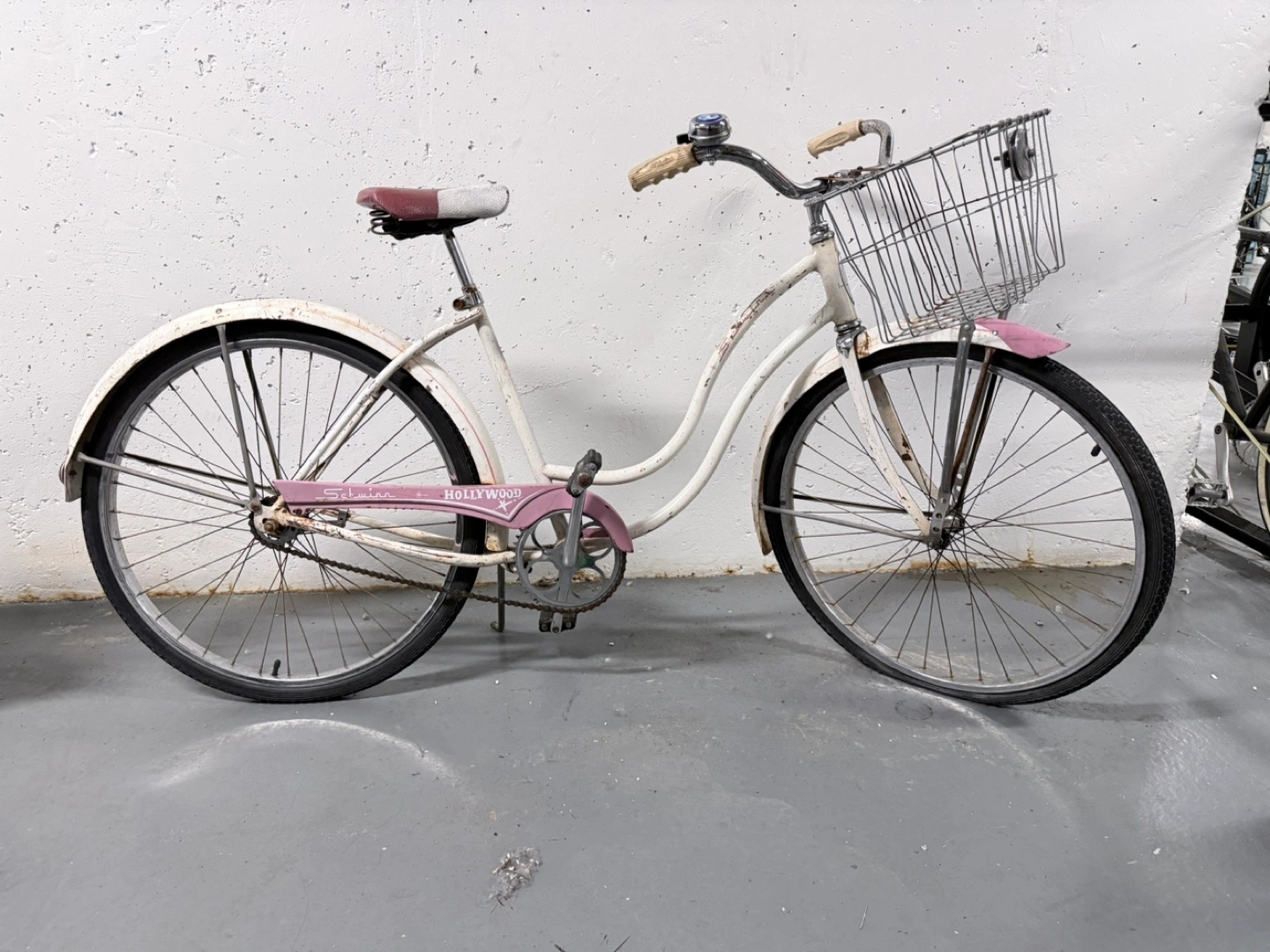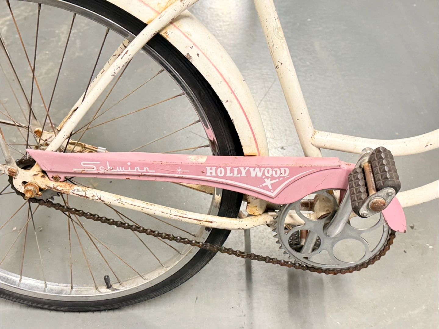 1000+Vintage 1970s Schwinn Hollywood Bicycle – Mostly Original Parts! This is a classic Schwinn Hollywood model in beautiful white with rose pink accents, matching fenders, and a charming front basket. The bike features an original step-through ladies frame and fork with factory paint and decals still intact. It includes: • Schwinn screen-style chainguard • Wide cruiser handlebars • Schwinn cruiser saddle • Original Schwinn grips and pedals • Full fenders • And more original components It’s equipped with a vintage 2-speed kickback hub and coaster brakes—just pedal slightly backward to brake or shift gears. These are super fun to ride, especially if you’ve never tried one before! Specs: • Tire size: 26 x 1.75” (tires replaced about 18 months ago) Flat tube at front tire!!! • Seat post clamp height from the ground: approx. 28” • Crank center to seat post clamp: standard cruiser geometry Brakes are in good working order, and the bike has been stored under cover in a dedicated bike room. Whether you’re riding it around town and turning heads or planning a full vintage restoration, this Schwinn is both a conversation starter and a rideable piece of history. I love this bike, but it deserves a new home where it can be appreciated and enjoyed. 🙏