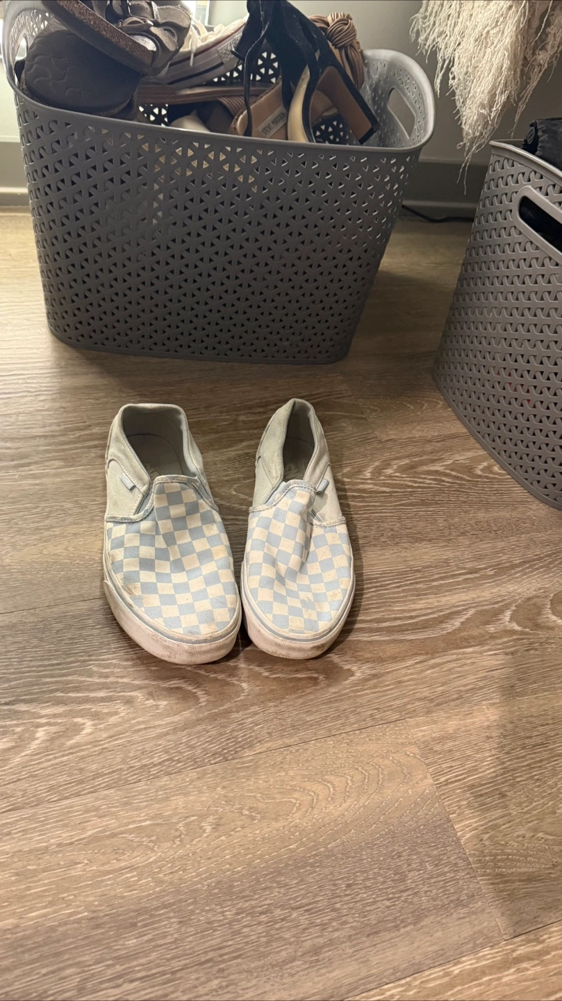 Selling a pair of Vans slip-on shoes with a light blue and white checkerboard pattern. They show some signs of wear, but still have plenty of life left!