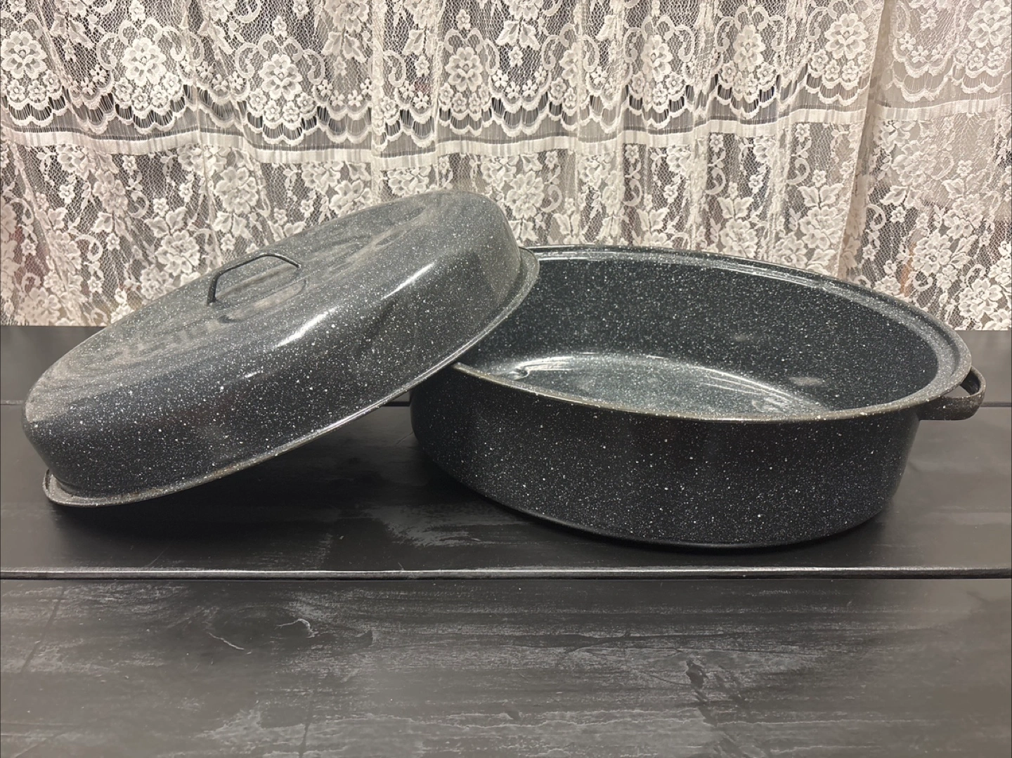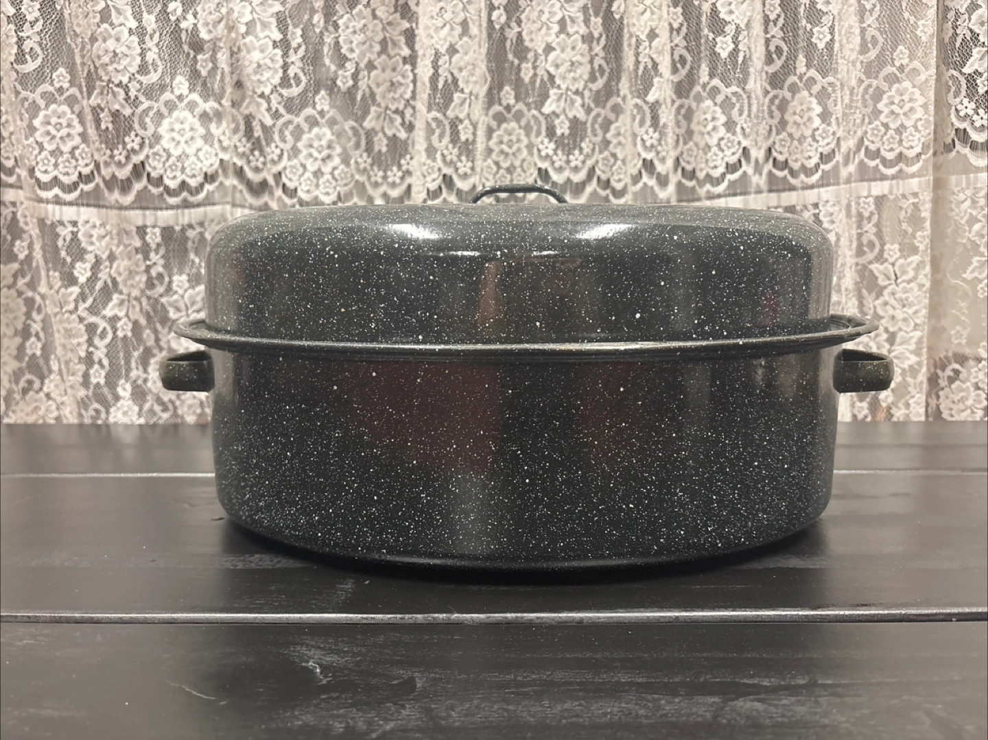 I'm selling a Granite Ware roaster with a lid. It's perfect for roasting meats, poultry, and vegetables. The speckled granite finish gives it a classic look. It's in good condition and ready for your next holiday meal!