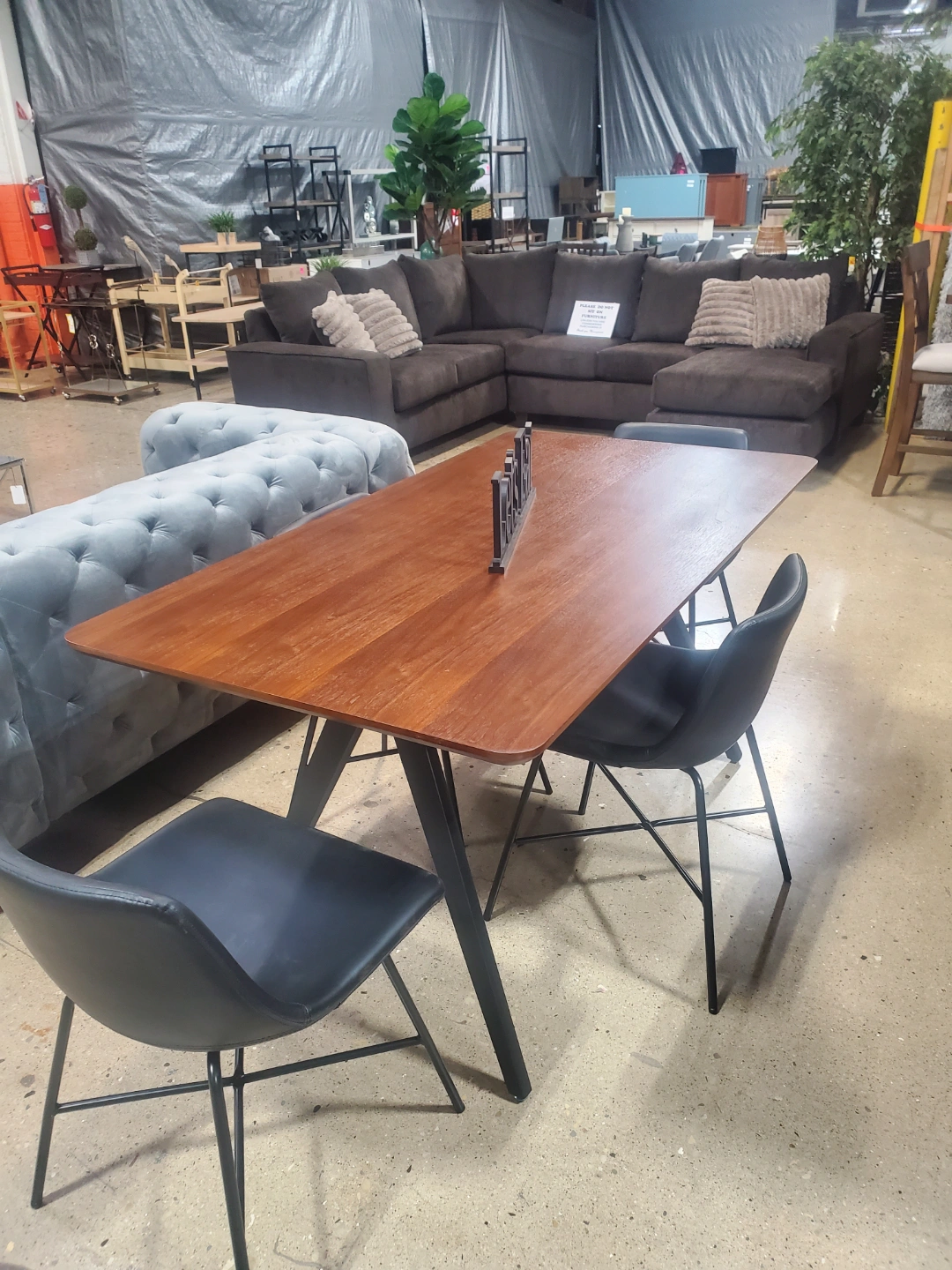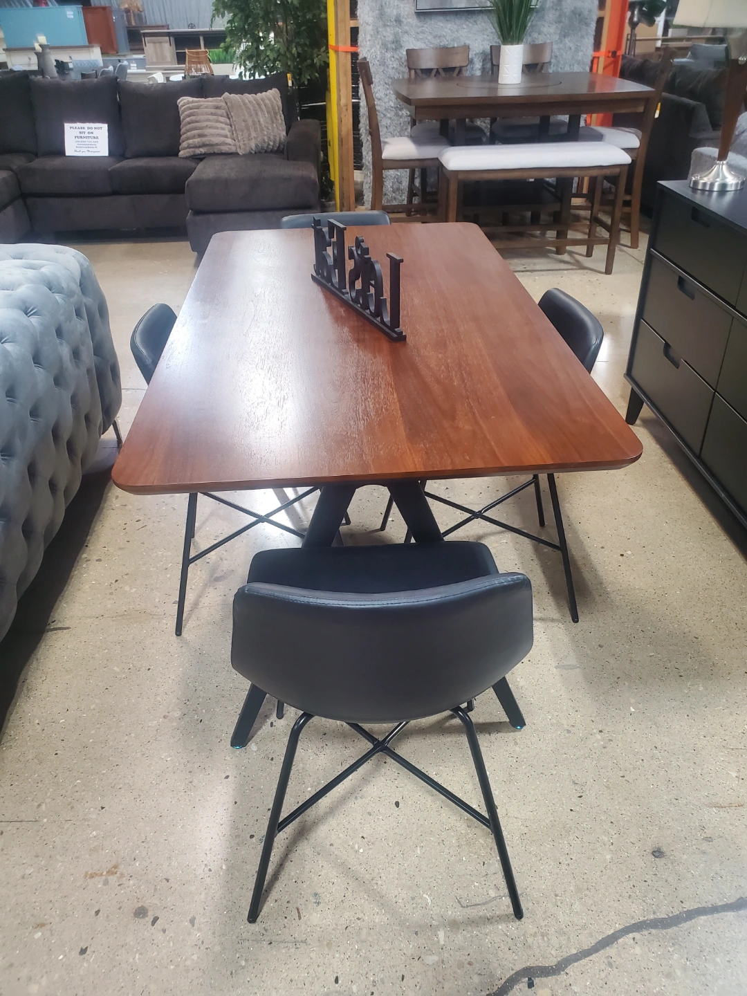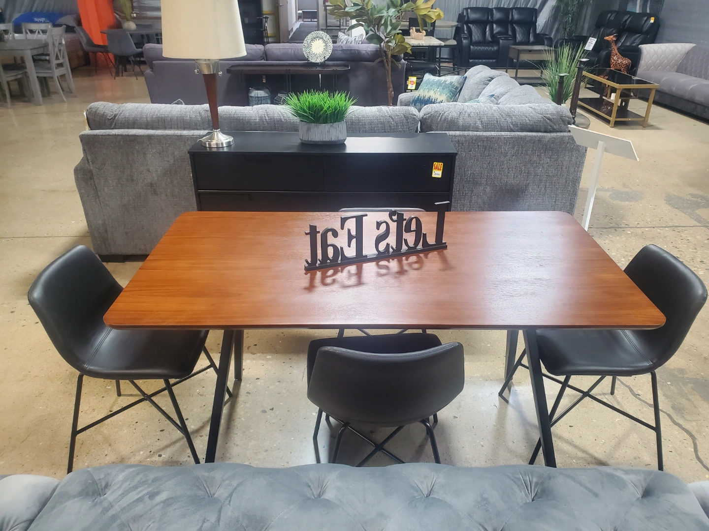 Mid Century Modern Style dining table with 4 faux leather chairs is going to be your new favorite hangout hub. Whether you use its sleek, spacious surface as a worktop for your laptop, a place for card game extravaganzas, or top it with a homecooked meal, this tabletop can host . Its minimal appeal starts at the base, with V-shaped legs for a homey yet futuristic aesthetic.dimensions: 30.5 H x 60 W x 32.25