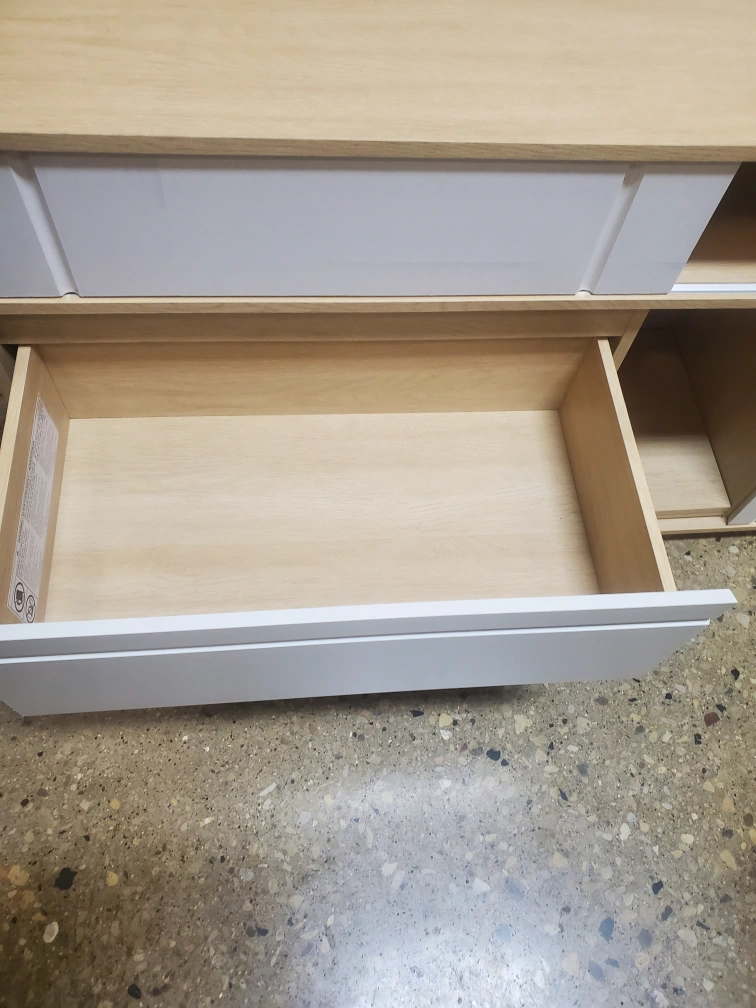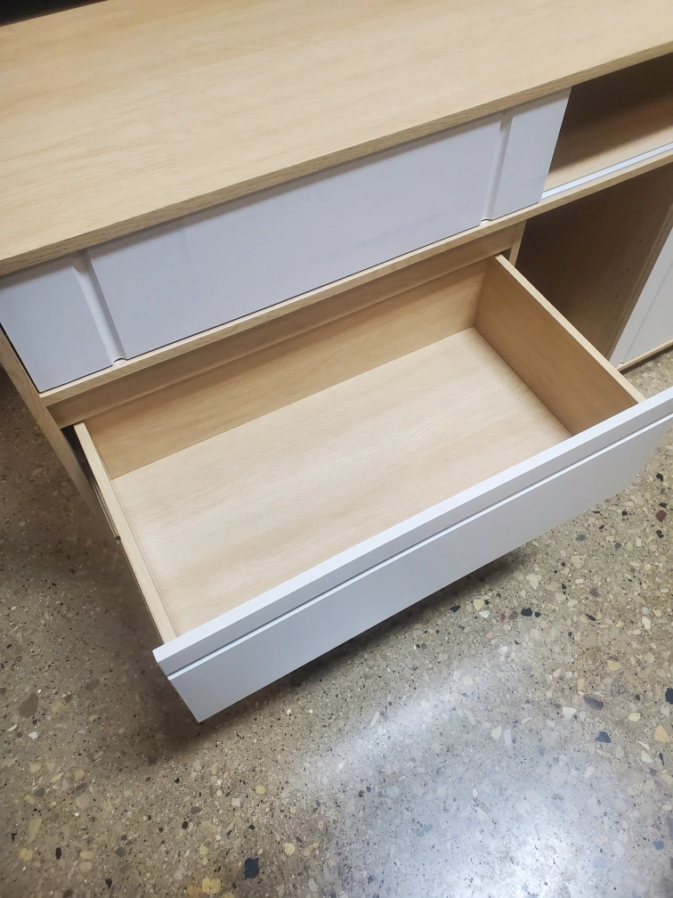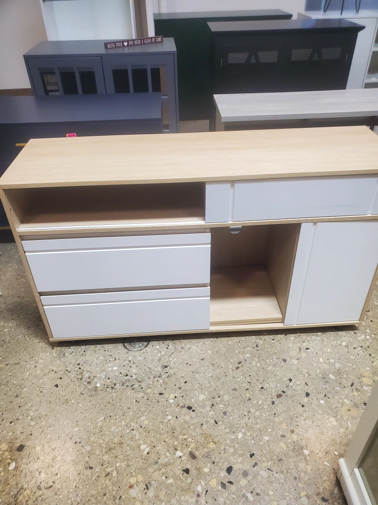 Contemporary Detailed-Door Sideboard with Open Storage in Coastal Oak and Solid White, a versatile and stylish addition to your living space. Crafted with precision and functionality in mind, this sideboard offers a blend of modern design and practical features to enhance your home decor.30'' H X 52'' W X 15.75'' D