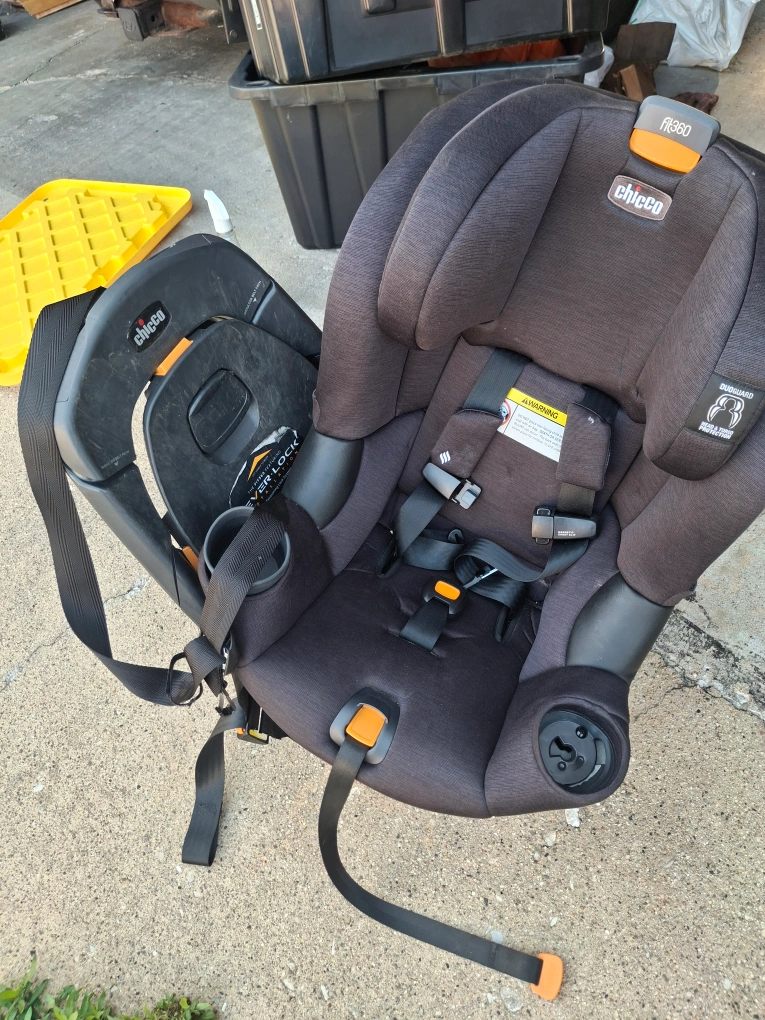 Selling a Chicco Fit360 rotating convertible car seat. It is black in color. This car seat features a unique rotating design, making it easier to get your child in and out of the car. It also has a cup holder for convenience.
