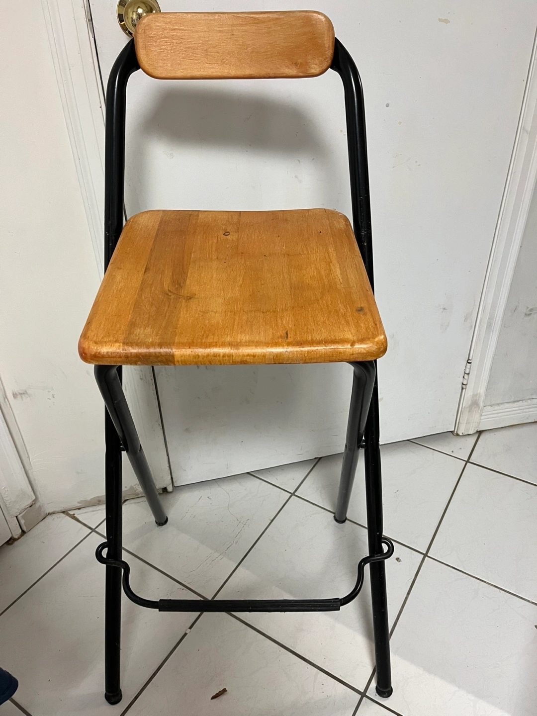 Selling a simple wooden folding stool with a black metal frame. It's perfect for extra seating when you have guests or for small spaces! It's in good condition and ready for a new home
