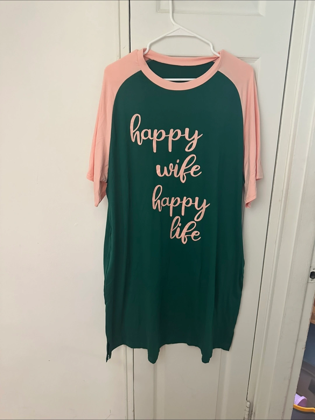 Cute and comfy nightgown with 'happy wife happy life' print! It's a size 2XL. Perfect for a cozy night in!