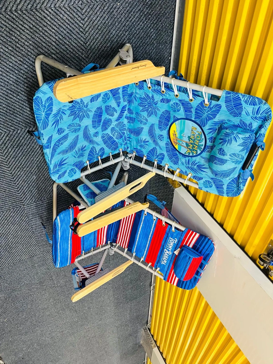 165Selling a pair of Tommy Bahama beach chairs! One is a vibrant blue with a tropical leaf pattern, and the other features classic red, white, and blue stripes. Perfect for relaxing at the beach or by the pool