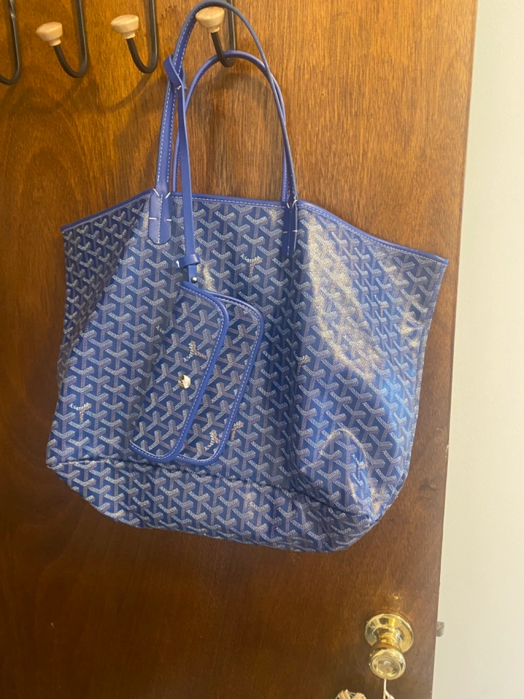 This is a Goyard tote bag in blue. It features the classic Goyardine pattern and comes with a detachable pouch. The bag is in good condition and ready for a new owner!