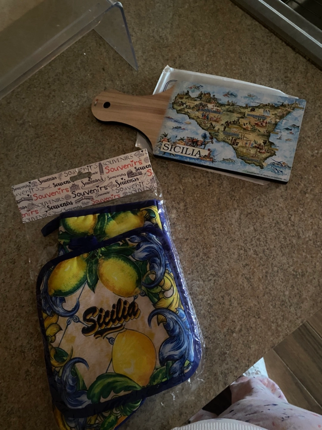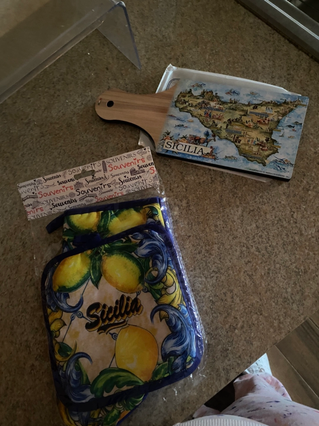 70I have a Sicilia-themed oven mitt and cutting board set. The oven mitt is blue with a lemon design, and the cutting board features a map of Sicily. They're still in their original packaging! Pick up in Bensonhurst bklyn Text 347-366-4713