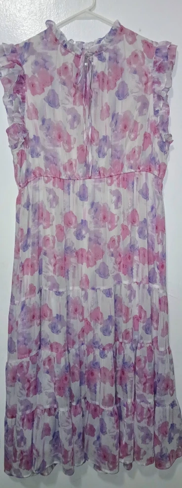 This dress features a lovely floral print in shades of pink and purple. It has a tiered design and ruffle detailing around the neckline and sleeves. Perfect for a spring or summer day!