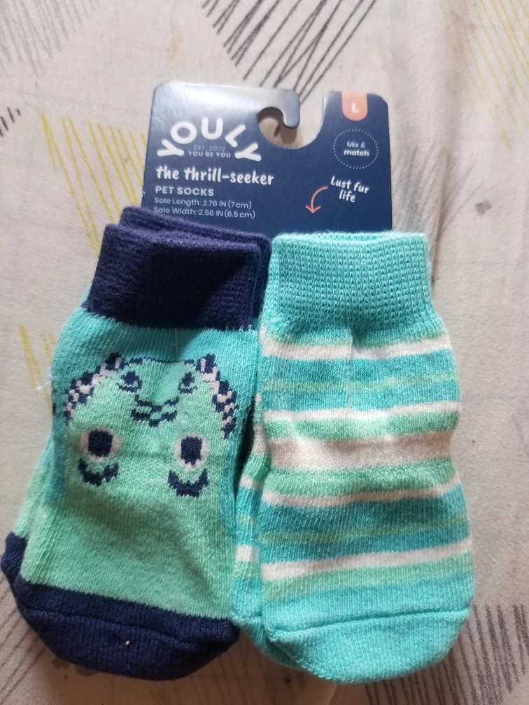 I'm selling a pair of YOUly 'the thrill-seeker' pet socks in size L! They feature a cute mix-and-match design for a 'lust fur life'. The sole length is 2.76 inches (7cm) and the sole width is 2.56 inches (6.5cm) cash only. no shipping. meet in person in public place. serious inquiries only