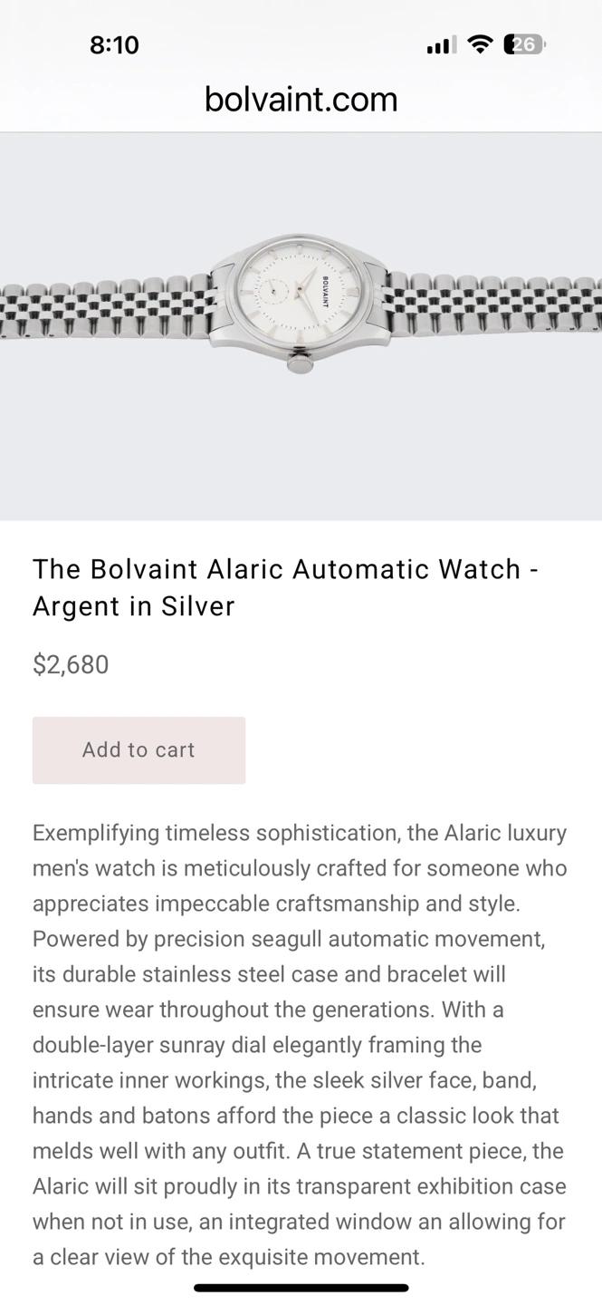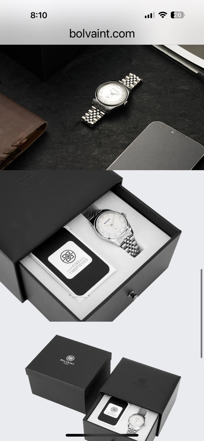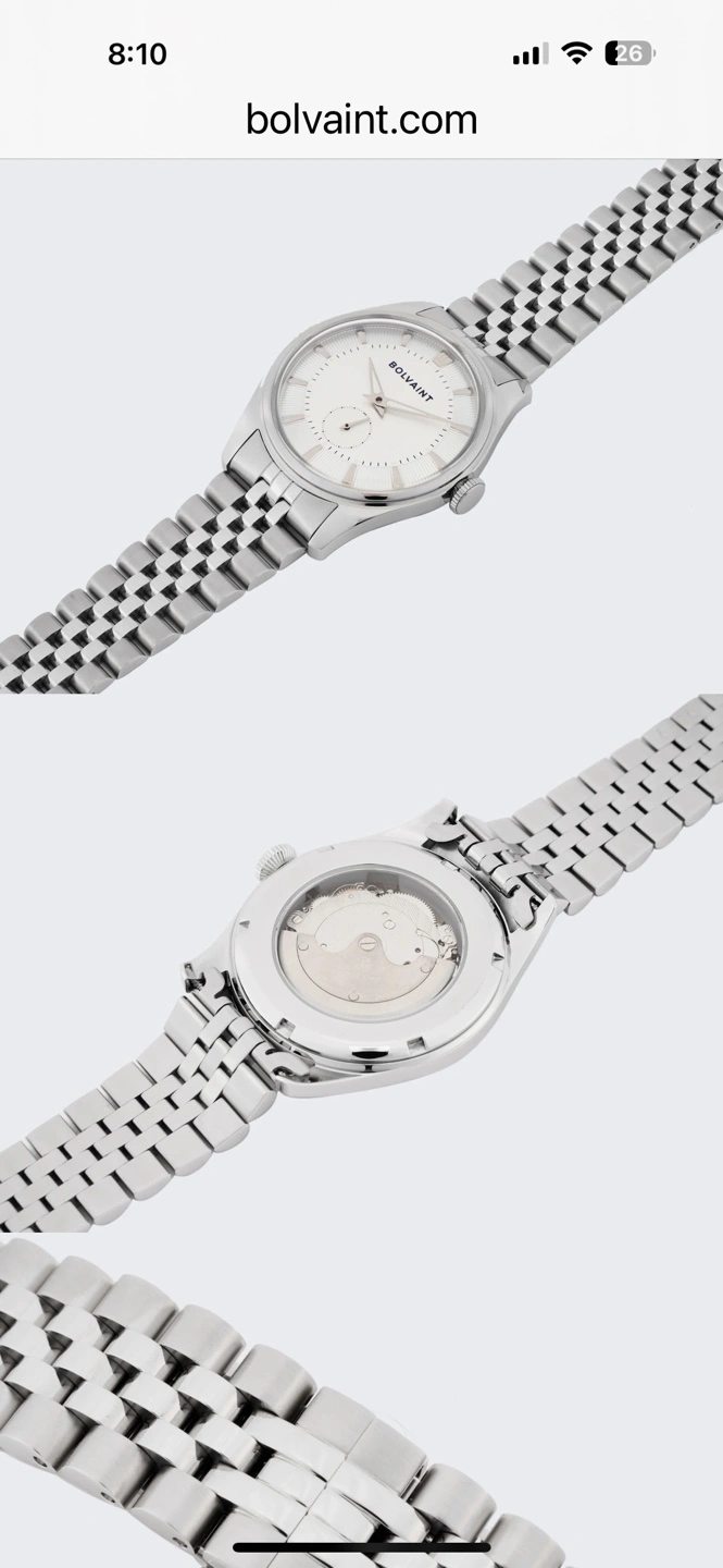 76Selling a Bolvaint Alaric automatic watch in silver! This luxury men's watch is crafted with seagull automatic movement and has a durable stainless steel case and bracelet. The double-layer sunray dial elegantly frames the inner workings. It comes with its original box!