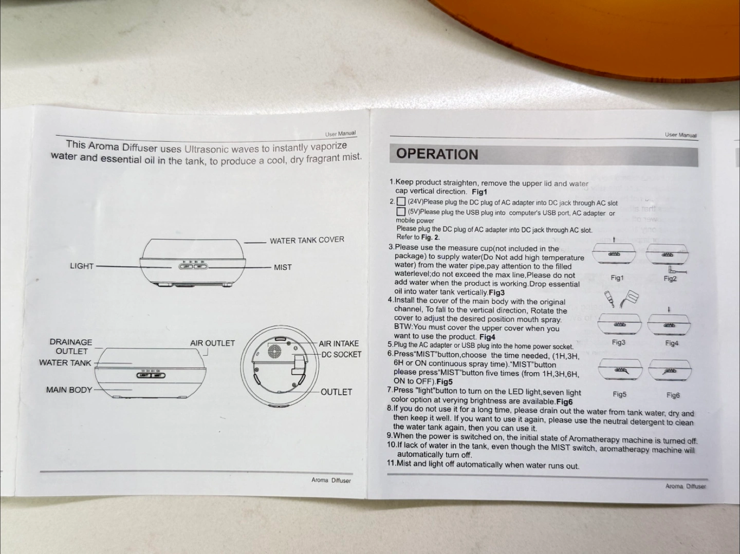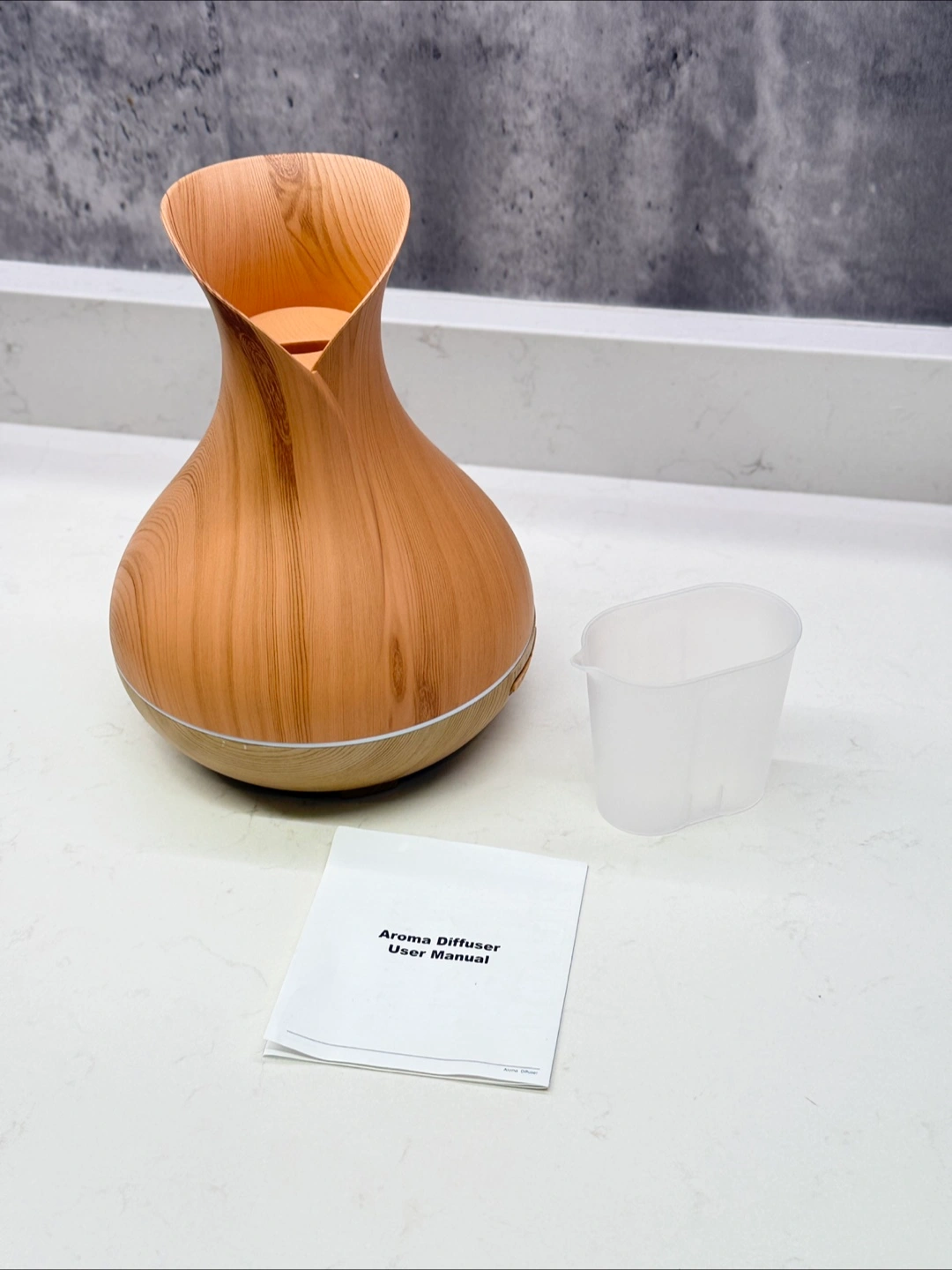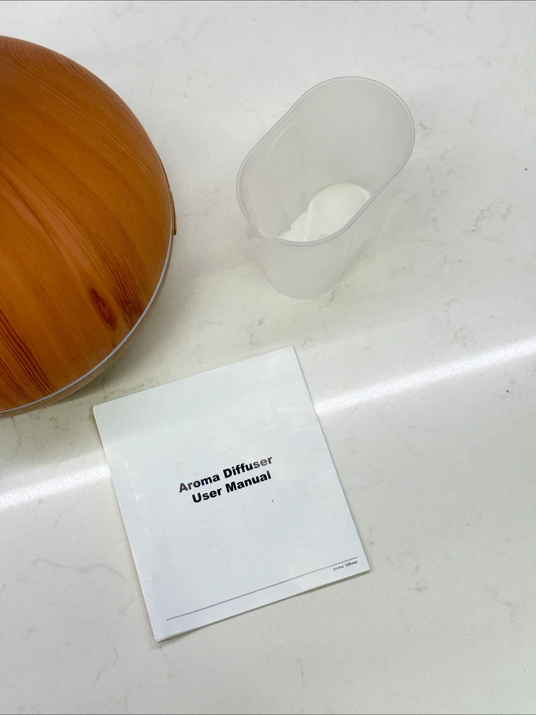 1000+Aroma diffuser that's in great condition! It comes with the user manual and a small plastic cup for easy filling. Condition is like new, clean and small abrasion at the bottom.