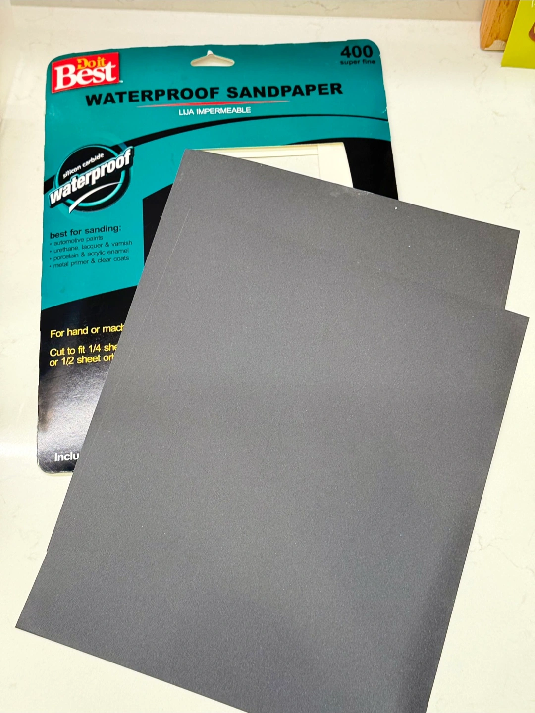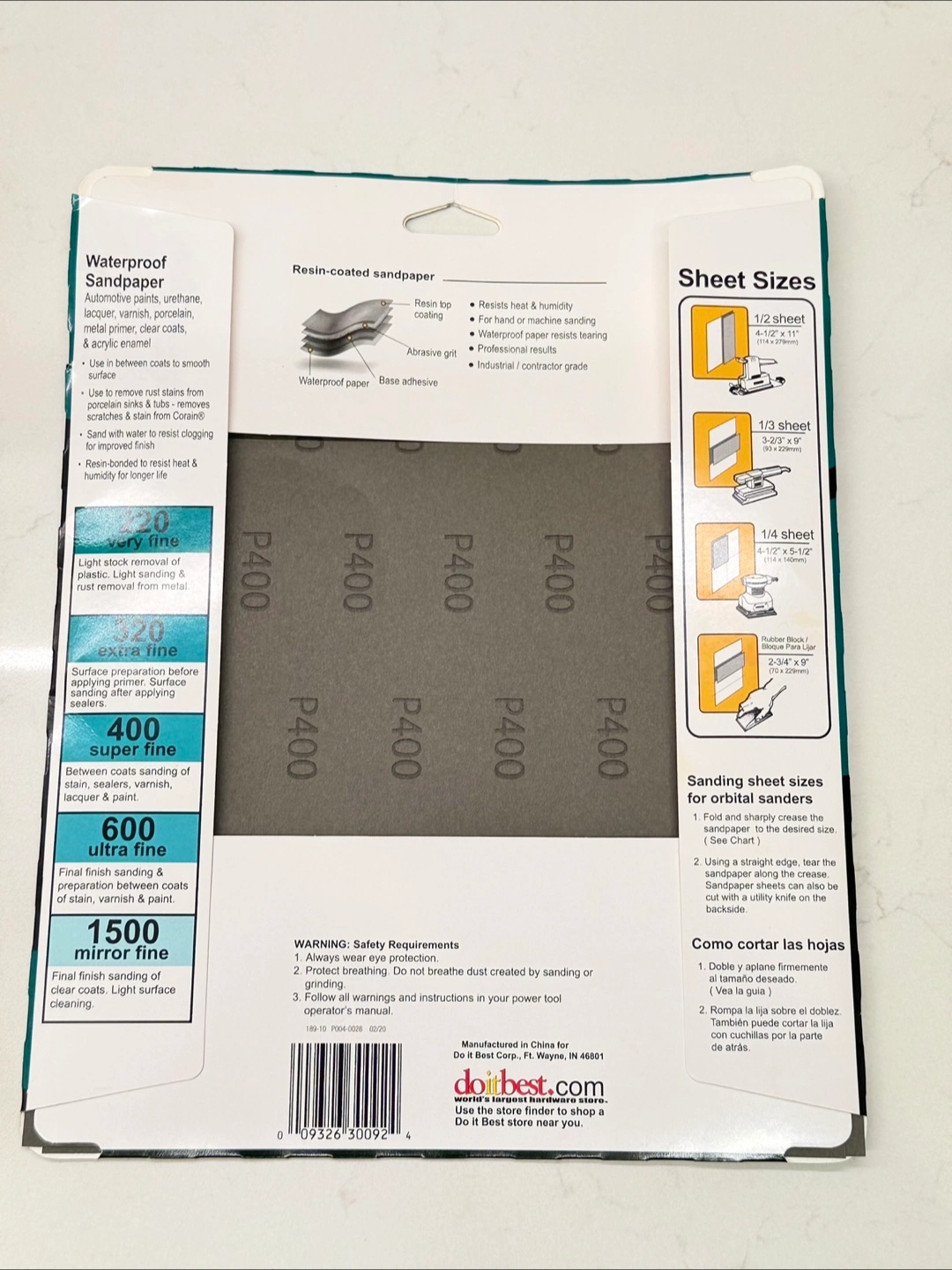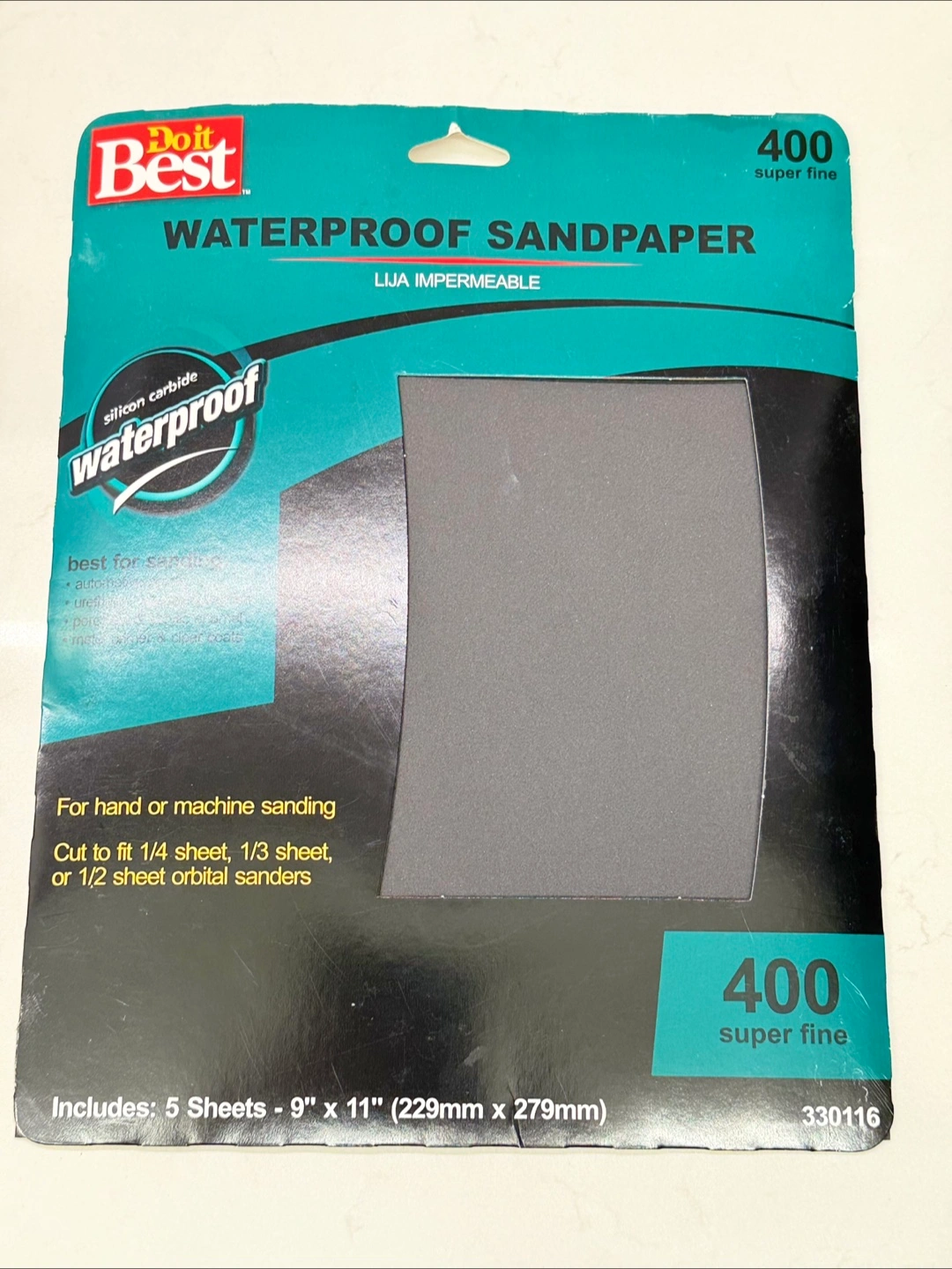 1000+2 sheets of Do It Best waterproof sandpaper, 400 super fine grit! Perfect for hand or machine sanding. Each sheet measures 9" x 11" (229mm x 279mm). Includes 5 sheets per pack. Great for automotive paints, urethanes, metal primer, clear coats, and acrylic lacquers