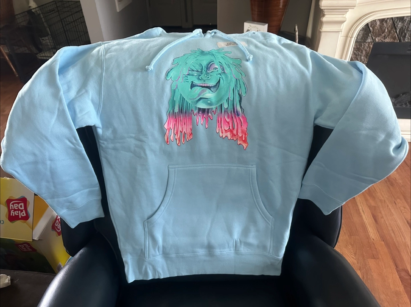 Light blue Holy Fvckin Smokes hoodie with a graphic design on the front and back. The material is soft and comfortable. Perfect for casual wear!