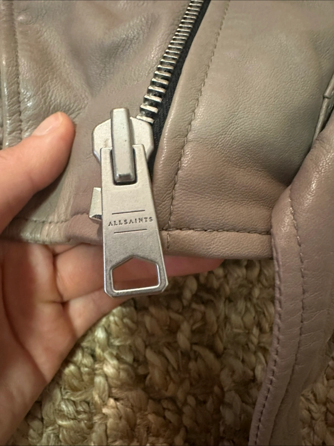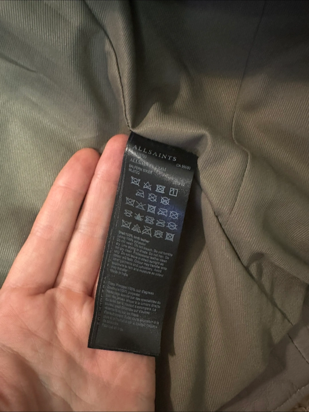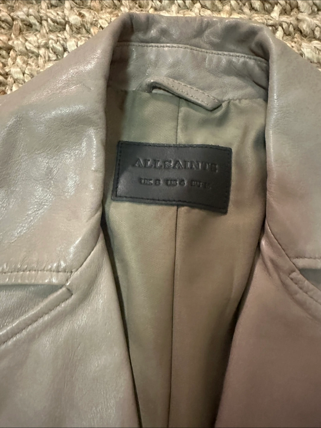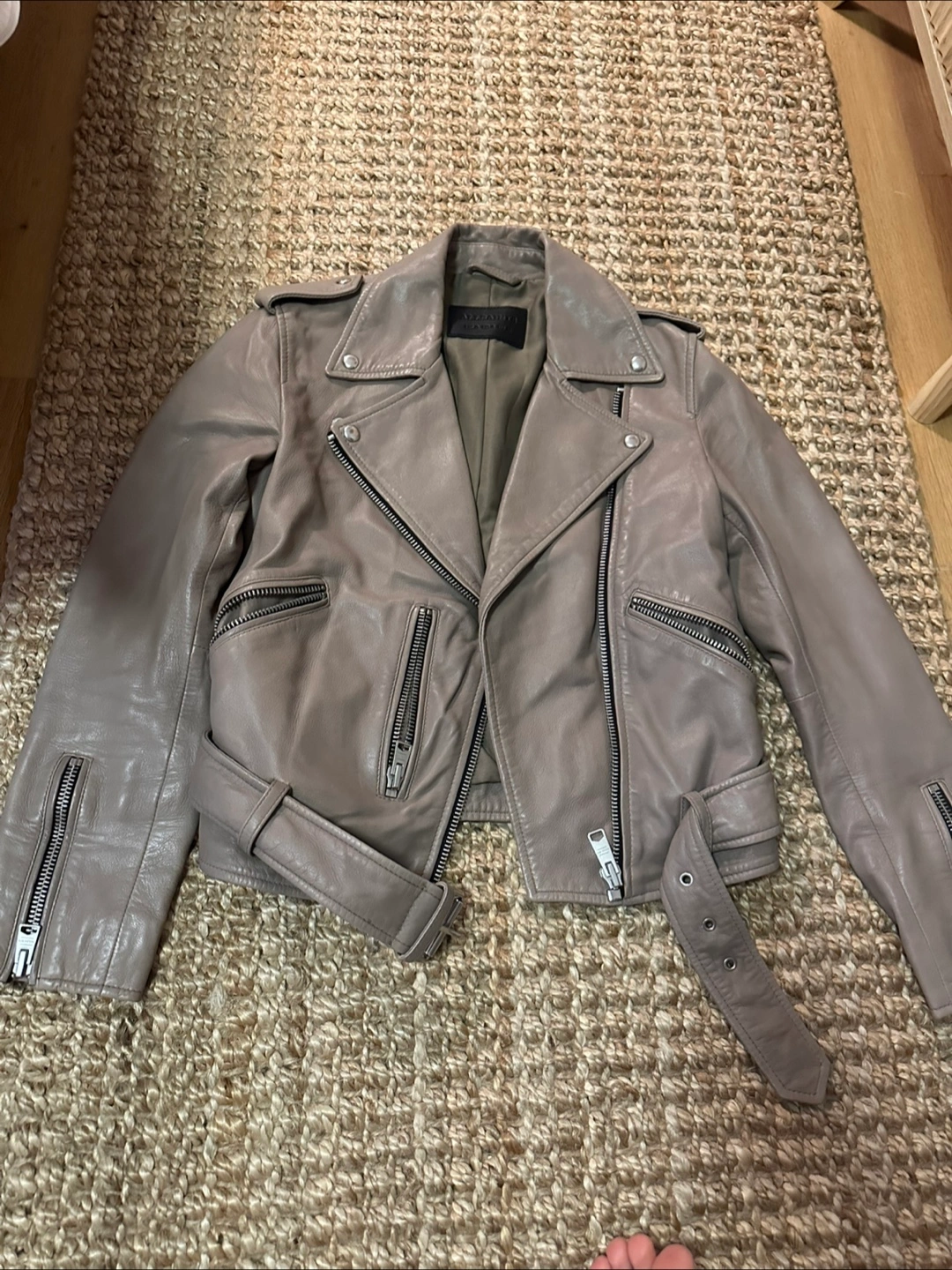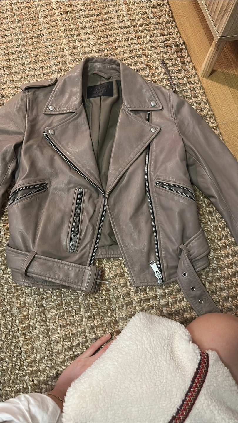 Selling a stylish AllSaints lamb leather biker jacket in size US 4. The jacket is made of 100% lamb leather and has a polyester lining. It features a classic biker design with zippers and a belted waist. It's in great condition and ready for a new home!