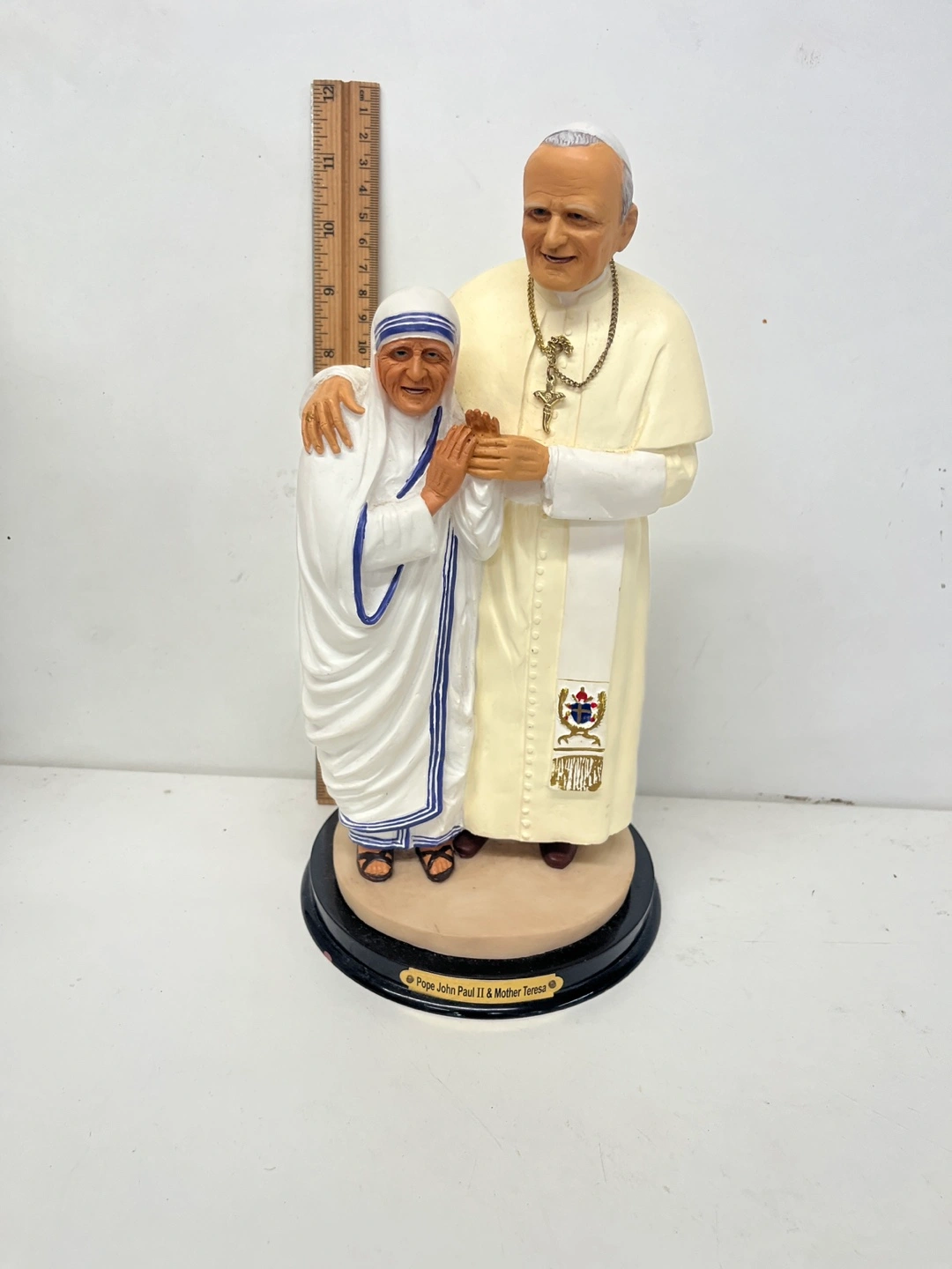 This is a statue of Pope John Paul II and Mother Teresa. It is in good condition and would be a great addition to any home or office