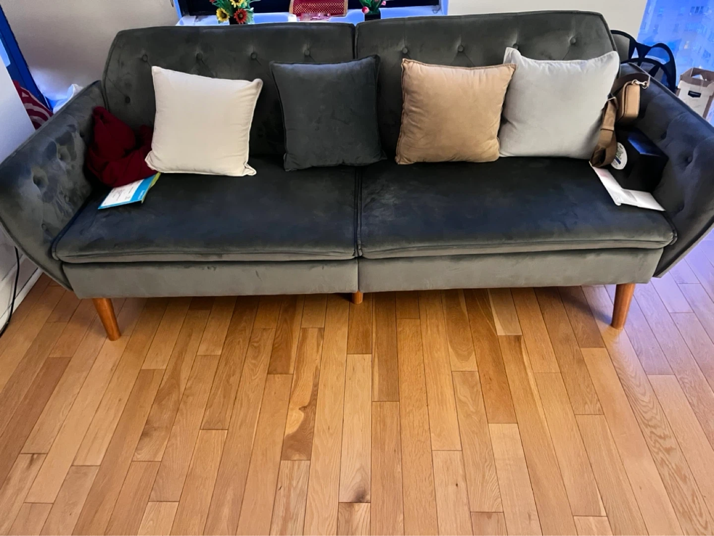 Gray velvet loveseat sofa. Tufted back design. Can be converted into a bed as well.