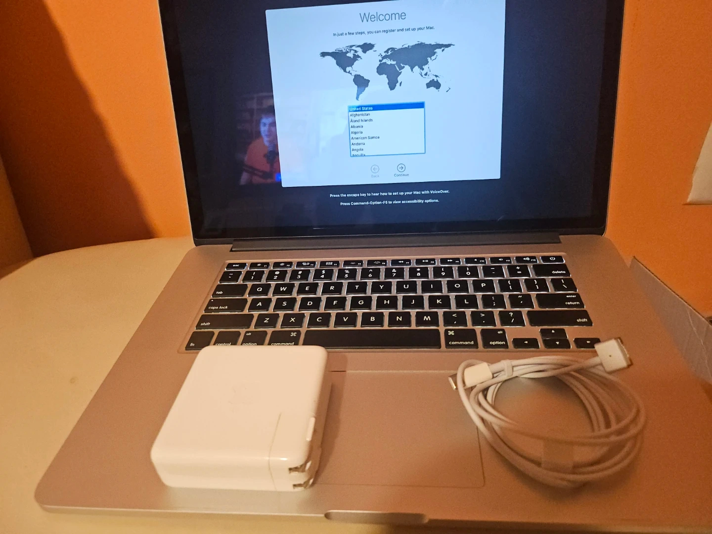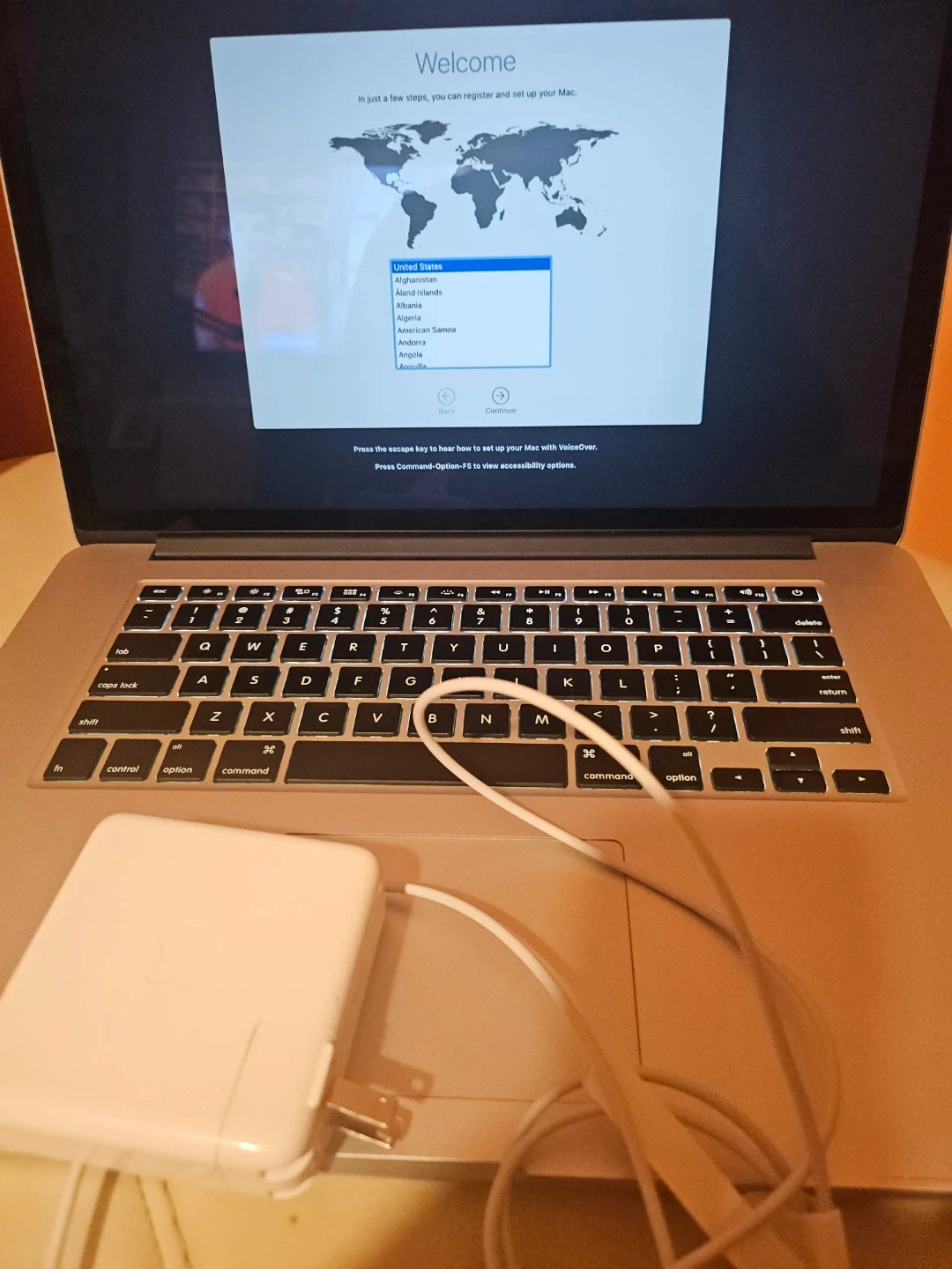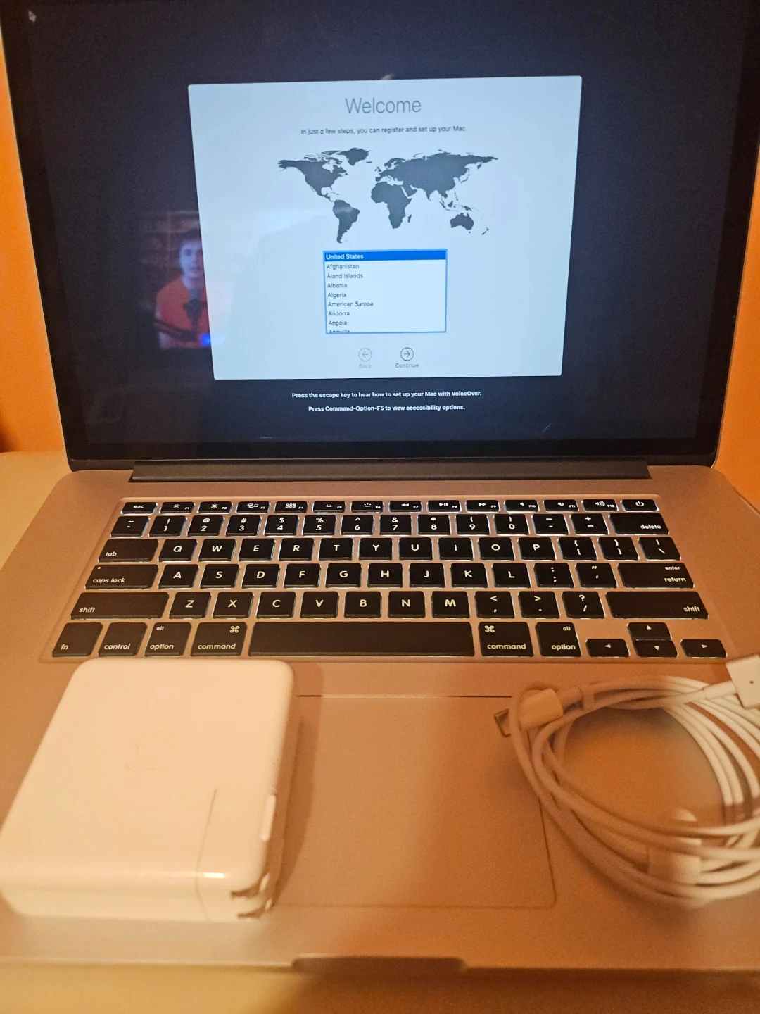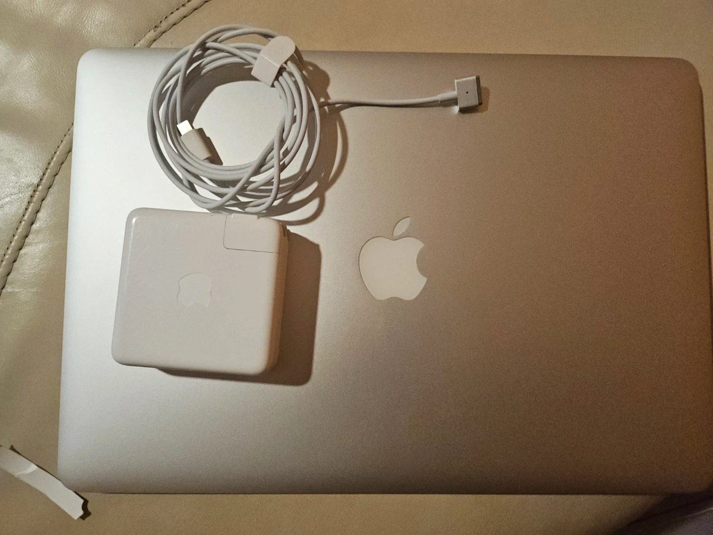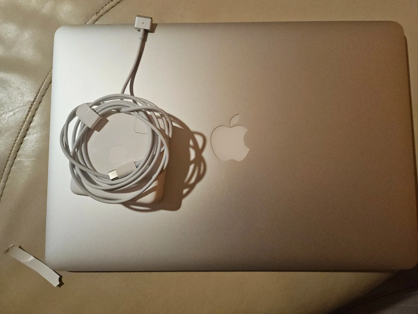 Sleek silver Macbook Pro Core i7 8GB 256 GB laptop ideal for home office use. Includes white charger for convenient power on the go. Clean silver finish and responsive keyboard for productive work sessions. Trusted Apple design for